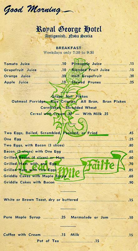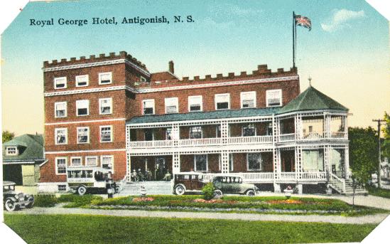 | Back |The Royal George has long been a popular Antigonish landmark. It was built in 1906 by C.E. Gregory, a local barrister and son of C.C. Gregory, a prominent engineer and barrister who lived at "Fernwood", now known as Mount Cameron. The building was designed by William Critchlow Harris, an Island architect with a flair for the fanciful. The 3-4 storey building with its flat roof, enclosed 2-storey verandah, hexagonal tower-shaped gazebo and crenellated parapet, a fashionable Tudor-Revival feature, had a castle-like appearance.