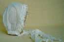 Item: COTTON BONNETComments: This machine-made cotton bonnet, with its fine stitching and lace trim, is most likely an indoor cap, probably a dust cap which was commonly worn in the home to protect women's hair from dust and soot. It also served to contain women's hair while they were doing housework.
