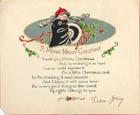 Comments:By the 1920s and 1930s, Christmas cards were far less elaborate than their Victorian counterparts. Late Victorian cards often featured tassels, paper lace, lush colouring and mechanical parts. The popularity of novelty cards declined significantly by the early 1900s, although the increased mechanization of printing made Christmas cards more affordable for a wider range of North Americans. In this card, a religious theme is conspicuously absent. The card simply shows a rosy-cheeked socialite looking stylish and stylized in her black cape and muff. By this time, cards were regarded as an essential convenience. Senders resorted to them instead of "writing Christmas letters or making personal holiday visits."