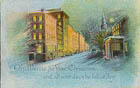 Comments: Sent by Minnie Brooks to Bessie Jones, this card shows a city street in winter. Every window is ablaze with warm yellow light. The message reads "Oh, merrie be your Christmas, and all your days be full of joy." With this card, the designers depicted the new realities of modernization such as electrification and urbanization. Whereas most cards harked back to romanticized Victorian times, this card is more contemporary. There is even a car depicted in the distance. Many card designers wanted to escape the harsh memories of the war and depression and looked to technology as the symbol of better times. This card is strikingly different from later Cold War cards with their predilection for humorous Santas and comical reindeer.