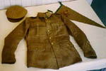 Item: SOLDIER'S WOOLEN TUNIC Comments: This tunic is made of heavy, woolen serge. The material is tough and sturdy--a winter-weight cloth. It was evidently a standard mass-produced tunic and was designed to be worn with pants; there was no allowance for the sporran as in the highland tunic below. This tunic has been extensively sewn and darned against both heavy use and moth holes. The buttons and hook and eye fasteners have been ripped out. The manufacturer's labels are barely legible. Although the unit and divisional patches have been removed, the sergeant's rank patch has survived. This patch is light khaki on dark and the ranks are of the British style, with four chevrons pointing down. Above the left cuff is another badge, a double strand of brass fluting under a single chevron. This tunic belonged to Sergeant Norman Kerr Cunningham, a travelling salesman from Antigonish. Judging by the handmade pennant, it is possible to surmise that Cunningham must have joined the 106th Overseas Battalion of the Nova Scotia Rifles. When the 106th Battalion was broken up for reinforcements, he must have made his way into the 6th Cdn. Mounted Rifles (6 CMR), where he remained until his release on 23 March 1918. Cunningham's demobilization card demonstrates that he was 5'7" and was 44 years of age when his war-time service terminated. The Museum also possesses Cunningham's cavalry pants, pennant, sewing kit, tool roll, light summer cap and heavy serge forage cap. The latter is made of resilient Olive Drab serge. It has a cloth-lined brow and is lined with a type of patent leather. There is an adjustable leather chin strap with corroded brass buttons. It is a typical soft serge cap with forage peak. The design was highly functional and was probably sturdy and bulky enough to keep the head warm through cold weather.