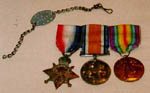 Item:WW 1 MedalsComments: These service medals belonged to Sergeant Norman Kerr Cunningham of Antigonish, Nova Scotia. Born in 1875, this one-time salesman enlisted as a Canadian soldier during World War 1. Cunningham received three medals in recognition of his military service: the 1914-15 Star, the British War Medal and Victory Medal (1914-18). The first medal, a bronze four-pointed star surmounted by a crown, featuring a laurel wreath enclosing a scroll with 1914-15, the Royal Cypher GV and two crossed swords, was awarded to "all who saw service in any theatre of war against the central powers between 5 August 1914 and 31 December 1915." There were 71,150 Star medals with their customary red, white and blue ribbons issued to Canadians after this award was authorized in December 1918. This medal was always accompanied by the British War Medal and the Victory Medal.