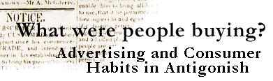 By the late 19th century, consumers--even in Antigonish--were tempted by an ever-growing cornucopia of products. As you look at the following advertisements, keep these questions in mind. What do these ads reveal about marketing, retailing, popular tastes and consumer culture in 19th-century Antigonish? When do you see the most pronounced shift to factory-made mass-manufactured items? At what point does the sheer variety and amount of goods increase? Do you see a shift to gender advertising, national-brand advertising or mail-order merchandising? During what decade did salesmanship become more aggressive and when did visual images begin to compete with print for the consumer's attention?"The old-fashioned home-made cloth has given way to the fine broadcloth coat: the linsey-woolsey dresses of females have disappeared, and English and French silks [have been] substituted; the nice clean-scoured floors of the farmers' houses have been covered by Brussels carpets; the spinning wheel and loom have been superseded by the piano; and, in short, a complete revolution in all our domestic habits has taken place."