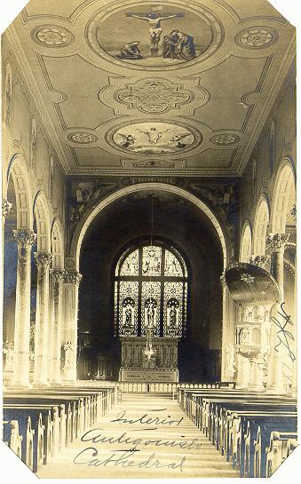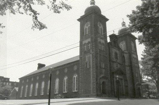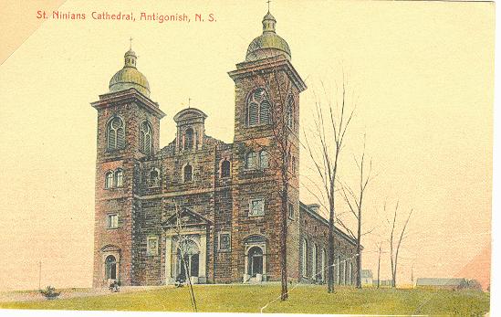 | Back |One of the most imposing structures in Antigonish is St. Ninian's Cathedral. This building was the brainchild of Bishop Colin F. MacKinnon who envisaged a stone edifice redolent of the Italian Renaissance basilicas he had seen during his nine years in Italy. The dream became a reality when he approved the design specifications submitted by the Montreal architect, A. Levesque, and the parishioners pledged an annual total of 900 pounds and volunteered three days of labour each week except during harvest season. The cornerstone was laid in June 1867 and over the next seven years the Cathedral with its thick walls, square towers and lanterned domes materialized. It was a far cry from its plain wooden predecessor built on Main Street in 1824. Seated on a height of land, it appeared to preside majestically over the town. Huge blocks of limestone and sandstone, some weighing as much as two tons, were hauled to the site by horse, oxen and wagon from North Grant and Brierly Brook.