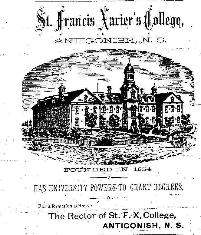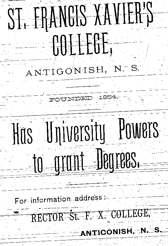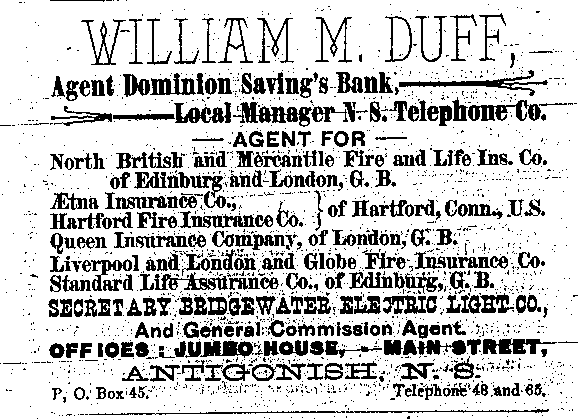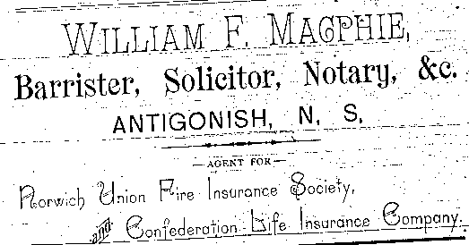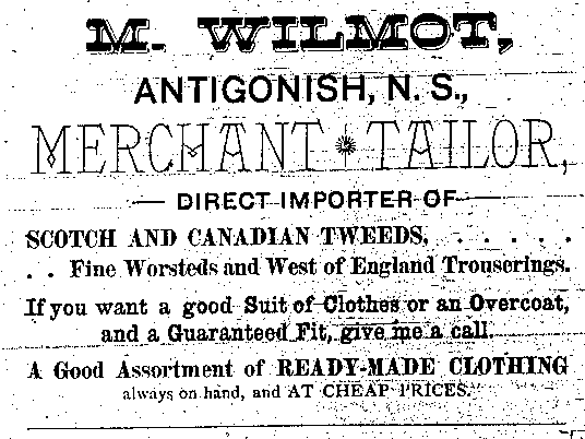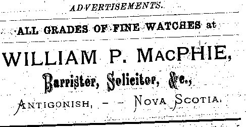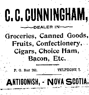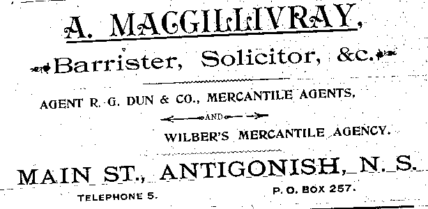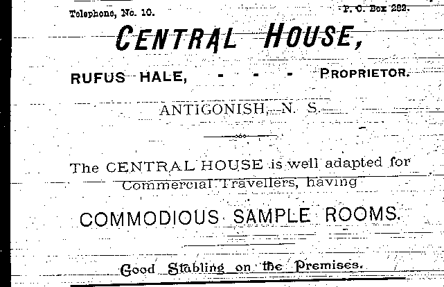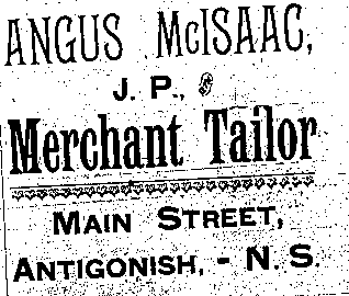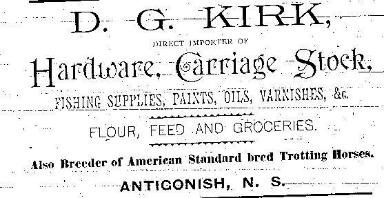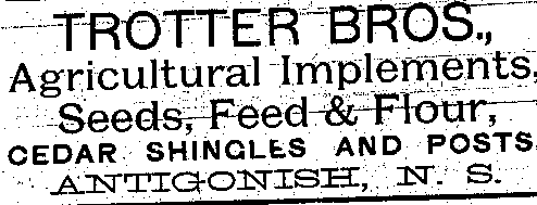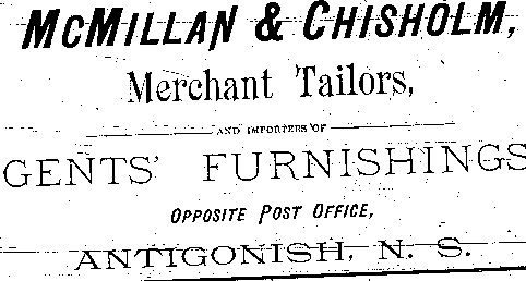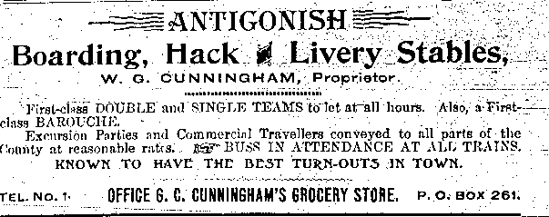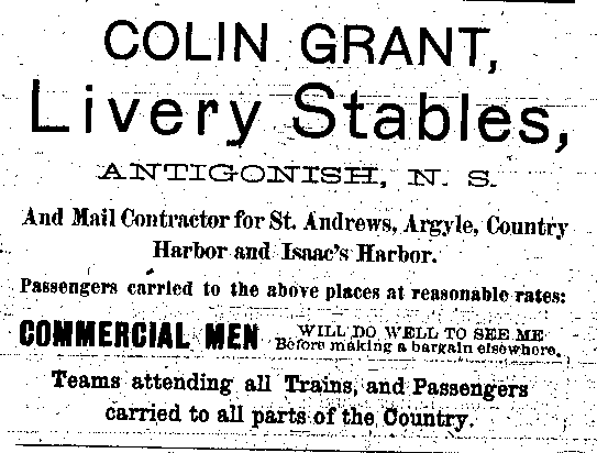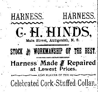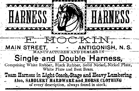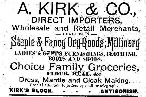 In the early 1890s, Antigonish had a population of about 2,000 people. An important mercantile centre, the town comprised forty five stores, four hotels, three livery stables, one steam saw mill, one cheese factory, one brickyard, three carriage factories and one woolen mill. The town was also home to St. F.X. College and Mount St. Bernard Convent, as well as a printing office and two banks, the Halifax Banking Company and the Merchant's Bank of Halifax. Antigonish was conveniently situated on the Intercolonial Railway Line. In 1892, a fare to New Glasgow and Halifax cost $1.20 and $3.96 respectively. The following advertisements from McAlpine's Directory and Gazetteer and Guide testify to the vitality of Antigonish's past. Just take a look!