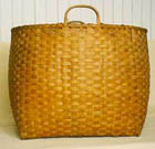Comments: This large basket is fashioned from rock maple wood. It is woven in a checkerboard pattern with overlapping undyed splints bent and reworked into the main design. It has a square base with curved sides and a rounded square top reinforced by a wooden hoop securely bonded to the basket by a thin splint whipstitched along the edge. There are also two hand-carved wooden handles protruding from the top which run the entire length of the basket, with the ends woven skilfully into the overall design.