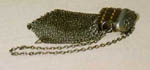 Item:CHAIN PURSEComments:The chain purse with its gate bag top and mesh construction was a popular Edwardian accessory. The gate was fitted with a clasp and was designed to expand. This style was usually equipped with a long chain as well as a finger ring that could be used to attach the bag to a belt. Both Victorian and Edwardian women were fond of fastening their purses to their belts, usually with a large, highly ornmental clasp. The narrow cut of dresses, after all, did not leave much pocket room for small purses.