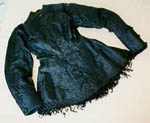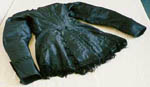 Item:BLACK TAFFETA TOP AND MATCHING SKIRTComments: This black taffeta outfit, lined with cotton, was part of the trousseau of Flora MacDonald. She wore the dress the day that she married stonecutter John MacIsaac in 1878. This two-piece ensemble was the handiwork of a Mrs. Chisholm (probably Margaret Chisholm) of St. Andrew's. It features a long hip-length jacket bodice, with buttons and darts, decorative ribbon on the long tight sleeves and in the front, and a decorative fringe along the bottom of the fitted top. The skirt has some distinctive elements such as flared pieces on the sides with bows and a pleated skirt border. The skirt (which is not shown) is long and tends to gather at the back near the waistline. The seamstress achieved some striking visual effects with her skilful use of fabric (such as the cloth-covered buttons) and form-fitting cut. This outfit must have been regarded as very fashionable and high-style for Antigonish in the 1870s.