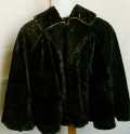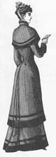 Comments:At the turn of the century, short jackets and capes were popular during the winter months. Black was the preferred colour, but navy, gray, various browns, even red and dark green, were also popular choices. This dark brown lined cape is made predominently of velvet. It has decorative wool trim around the neck which is joined by a hook and eye at the throat. There is also an intricate curvilinear beaded design along the bottom edge of the cape. In the 1880s, the price of mantles and cloaks ranged from $4.00 to $7.00.