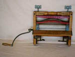 Comments:This clothes wringer is made of wood and was designed to fit a galvanized iron or wooden tub. It has a wooden handle attached to a metal arm as well as solid rubber rollers and turn grip steel clamps. This wringer was relatively easy to use. It could be placed on the side of the washtub and secured into position by the steel clamps. The hand crank operated the mechanism and the clothes were fed in between the two rubber cylinders to wring out the excess water. This model has a clear manufacturer's stamp. It was produced by "Downswell M'F'G'Co. Ltd" of Hamilton, Ontario. Similar models featured in the T. Eaton Company 1901 Catalogue ranged in price from $2.50 to $3.45. The wringer has other markings as well, including directions. One side has the printed words: "Covered cogwheels, safety, steel ball bearing."