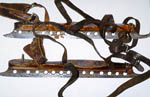 Comments: This pair of machine-made skates has wooden tops, leather straps and metal steel blades. At this time, skates were strapped onto the boots (sometimes called "Sunday boots") and secured by a screw nail through the boot's heel. Later skates were clamped to the sole of a boot by a spring-lever action or by tightening a screw with a key. The top of these skates bears the scratched initials WSA, signifying the original owner, William Snow Archibald (1873-1960), a prominent local businessman, son of the first mayor of Antigonish, and one-time medal winner in figure skating. Archibald allegedly refereed the first known hockey match in Antigonish and in 1946, at the age of 71, he gave an exhibition of figure skating at the St. F.X. Memorial Rink.