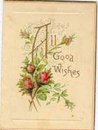 Comments:This Christmas card with its design of red rosebuds and message of "All Good Wishes" was originally sent by Mrs. A. Bannerman. The inside inscription reads "All joy be yours this happy day". The card bears little resemblance to the typical Christmas card. There are no romanticized scenes of children playing or winter wonderlands. It is interesting to note that the sender opted for the red rose of England, a symbol that was so explicitly British. The card itself is vaguely festive. By the 20th century, the machine-made Christmas card with its ready-made one-line greeting provided people with an easy method of communication; "it was suitable for mass use with acquaintances with whom the senders were not on letter writing terms." In this way, Christmas cards became an impersonal way to send greetings for the holidays.