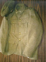 Item: SOLDIER'S WOOLEN TUNIC Comments: This tunic is made of heavy, woolen serge. The material is tough and sturdy--a winter-weight cloth. It was evidently a standard mass-produced tunic and was designed to be worn with pants; there was no allowance for the sporran as in the highland tunic below. This tunic has been extensively sewn and darned against both heavy use and moth holes. The buttons and hook and eye fasteners have been ripped out. The manufacturer's labels are barely legible. Although the unit and divisional patches have been removed, the sergeant's rank patch has survived. This patch is light khaki on dark and the ranks are of the British style, with four chevrons pointing down. Above the left cuff is another badge, a double strand of brass fluting under a single chevron. This tunic belonged to Sergeant Norman Kerr Cunningham, a travelling salesman from Antigonish. Judging by the handmade pennant, it is possible to surmise that Cunningham must have joined the 106th Overseas Battalion of the Nova Scotia Rifles. When the 106th Battalion was broken up for reinforcements, he must have made his way into the 6th Cdn. Mounted Rifles (6 CMR), where he remained until his release on 23 March 1918. Cunningham's demobilization card demonstrates that he was 5'7" and was 44 years of age when his war-time service terminated. The Museum also possesses Cunningham's cavalry pants, pennant, sewing kit, tool roll, light summer cap and heavy serge forage cap. The latter is made of resilient Olive Drab serge. It has a cloth-lined brow and is lined with a type of patent leather. There is an adjustable leather chin strap with corroded brass buttons. It is a typical soft serge cap with forage peak. The design was highly functional and was probably sturdy and bulky enough to keep the head warm through cold weather.