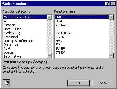 The first step in using the Function Wizard is to select the function you want to work with from the list presented. Broad categories appear on the left, and individual functions on the right.