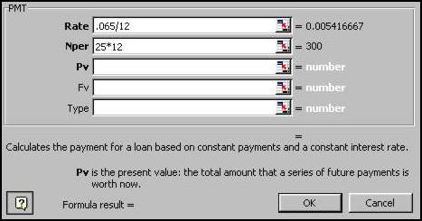 The formula PMT(5%/12, 15*12, 0, 100000) returns the monthly payment ($374.13) required to save $100,000 over 20 years at an interest rate of 5%. Notice that the pv, or present value, place in the formula is filled in with a 0, as the current value of the savings is $0.