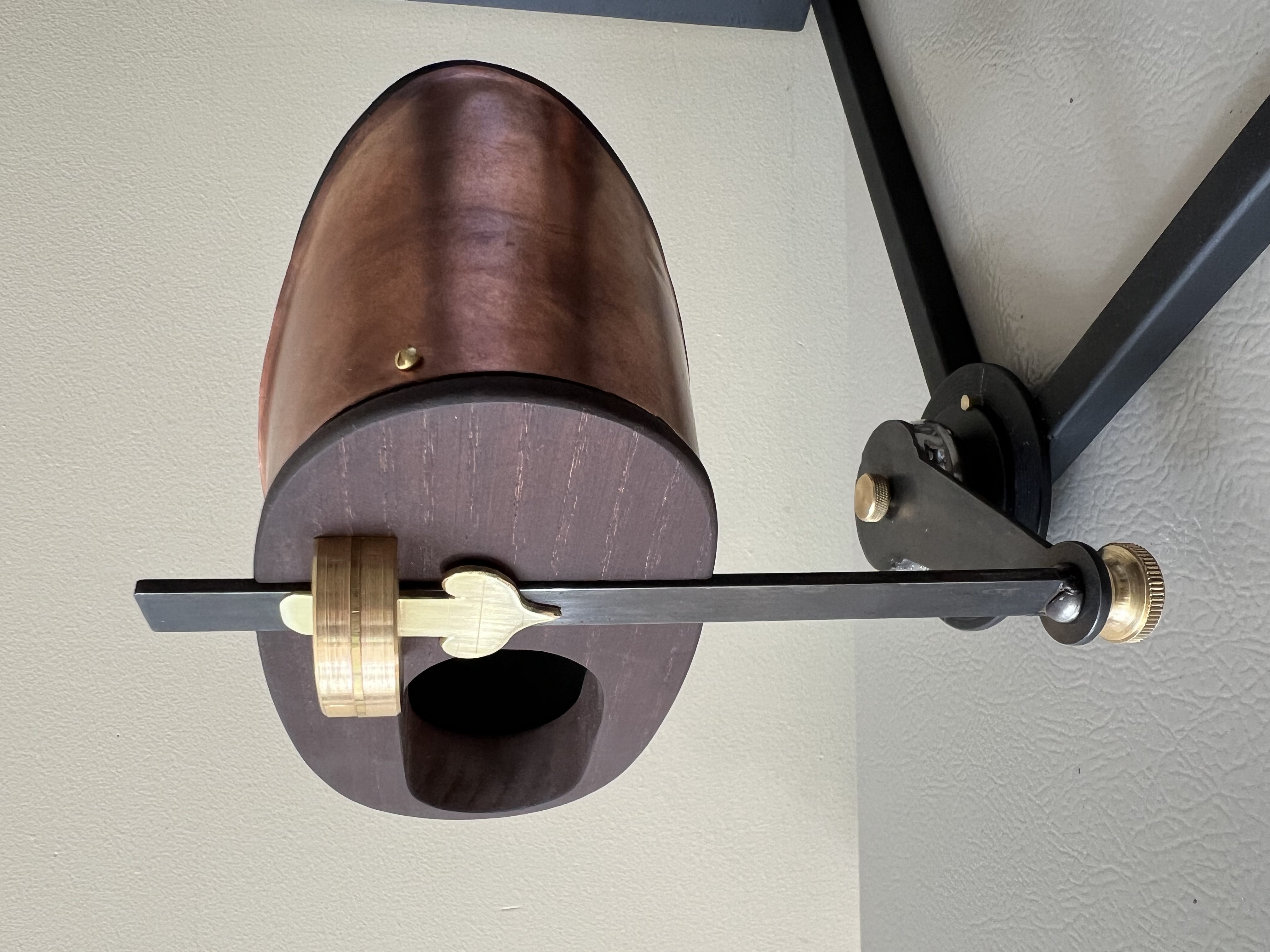 Just for fun, instead of a knurled thumbscrew to secure the viewing-piece on its vertical post, I decided to try a decorative brass wedge (Figure 3). My aim is to bring attention to the way that viewing is mechanically mediated.