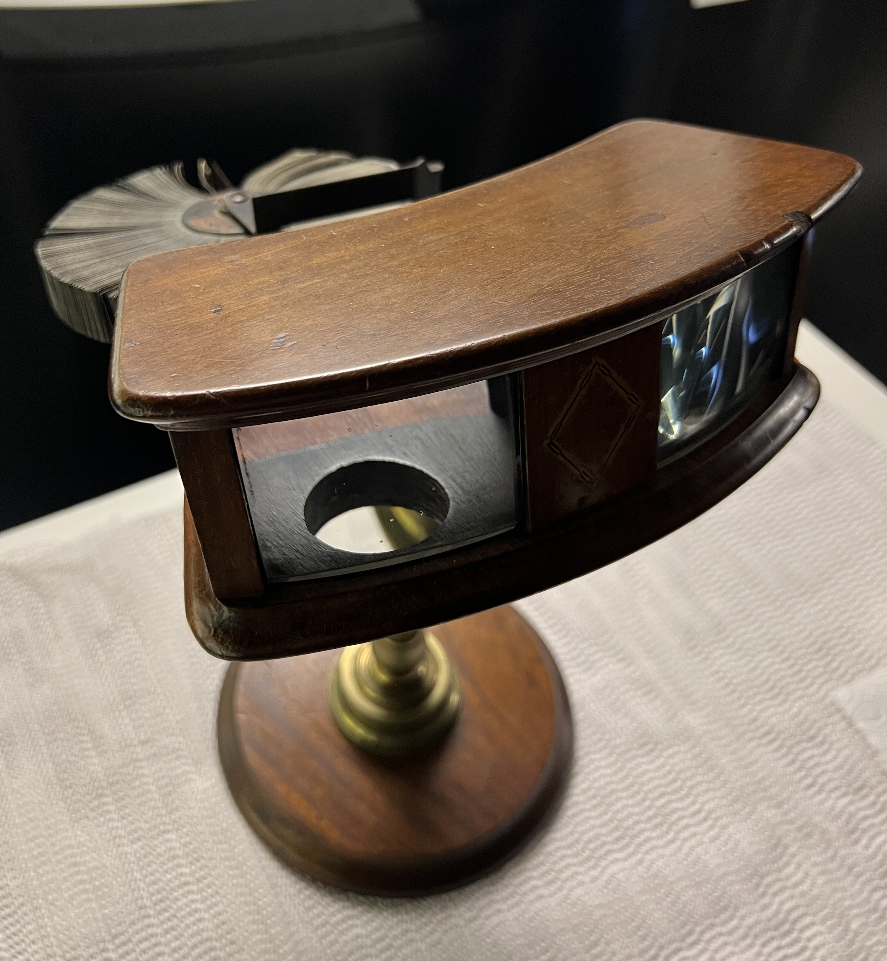 This is a hand-cranked flip-book in which the animated image is enlarged and 3D-enhanced by two biconvex lenses. It is an example of an "optical machine" and is included in the Optical Machine Taxonomy