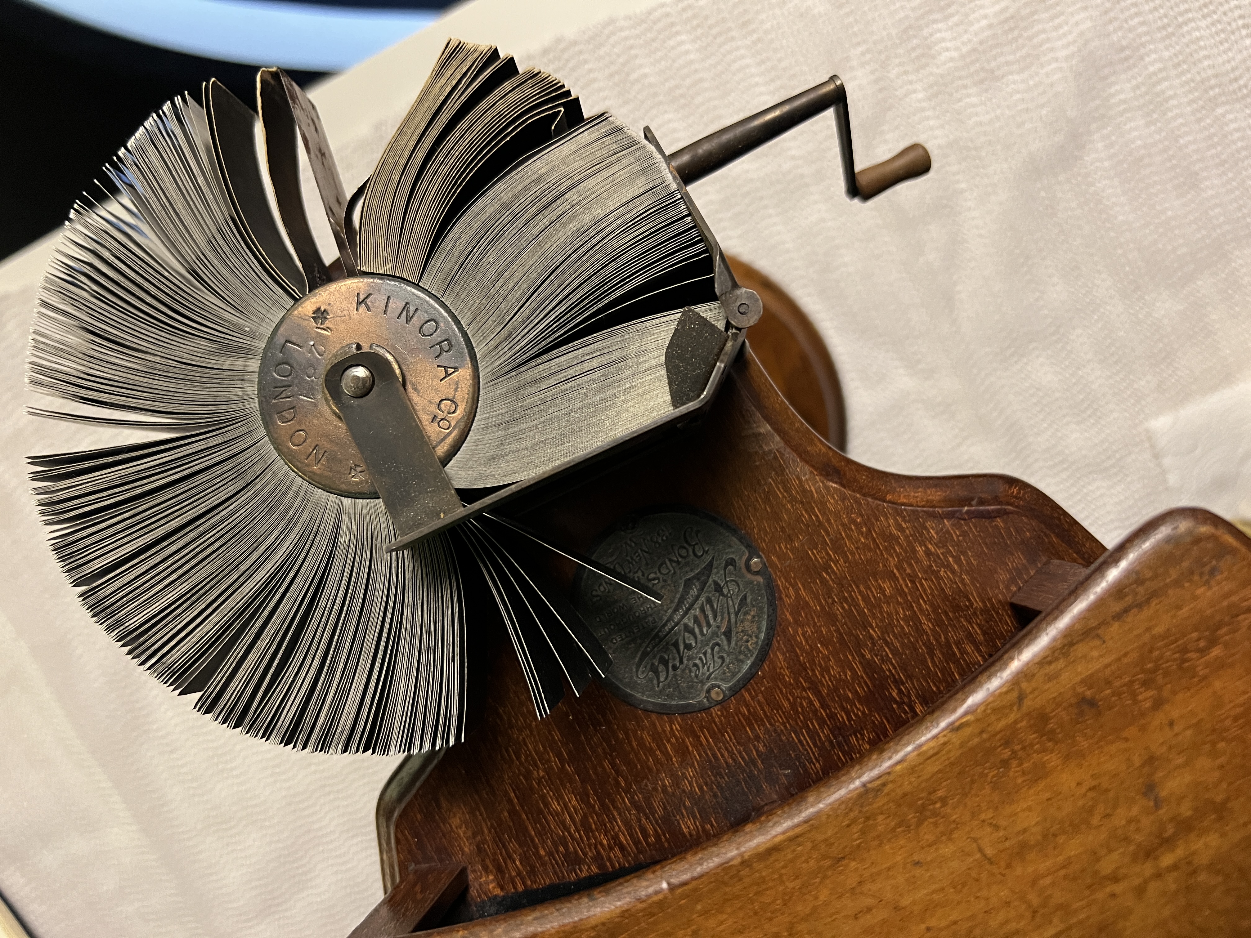 The Kinora is a mash-up between the 3D optical machine and an early form of animated image. A number of attempts were made after 1838 to combine Wheatstone's stereoscopic 3D technology with the early motion principles of Plateau's phenakistiscope. The Kinora is the first to apply stop-motion animation to the 18th-century convex-lens 3D technology.
