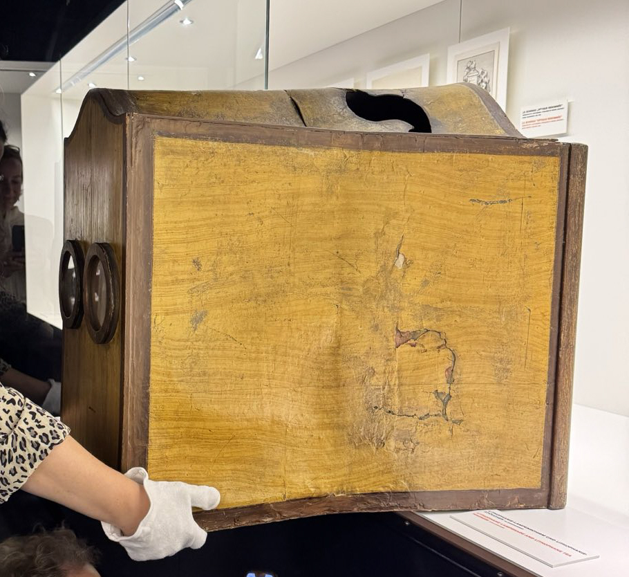 The styling is original and unique. To illuminate the front of the image, the maker has cut f-shaped holes in a curved top like the belly of a violin or viola. For this reason I call it the viola guckkasten. The sides curve outward to a wide front containing the two lenses. This flaring outward is typical of Italian mondo niovos. The curved top is made of pasteboard and the sides of wood veneer.