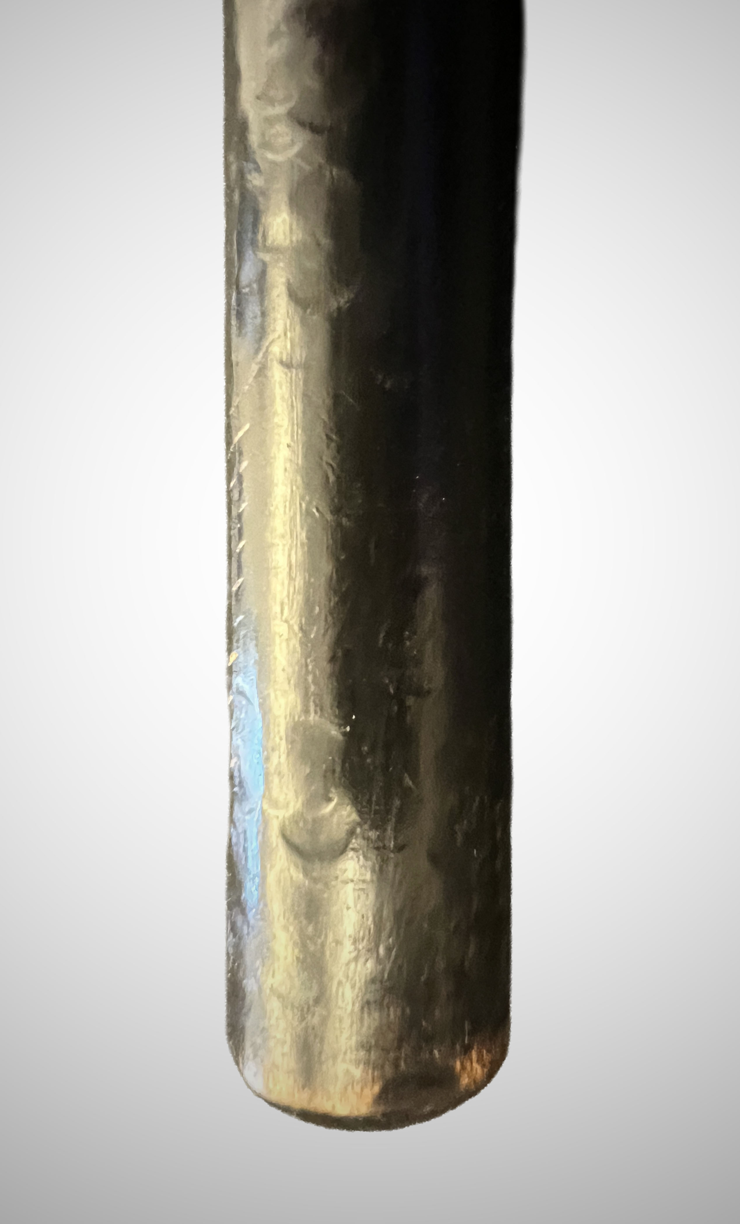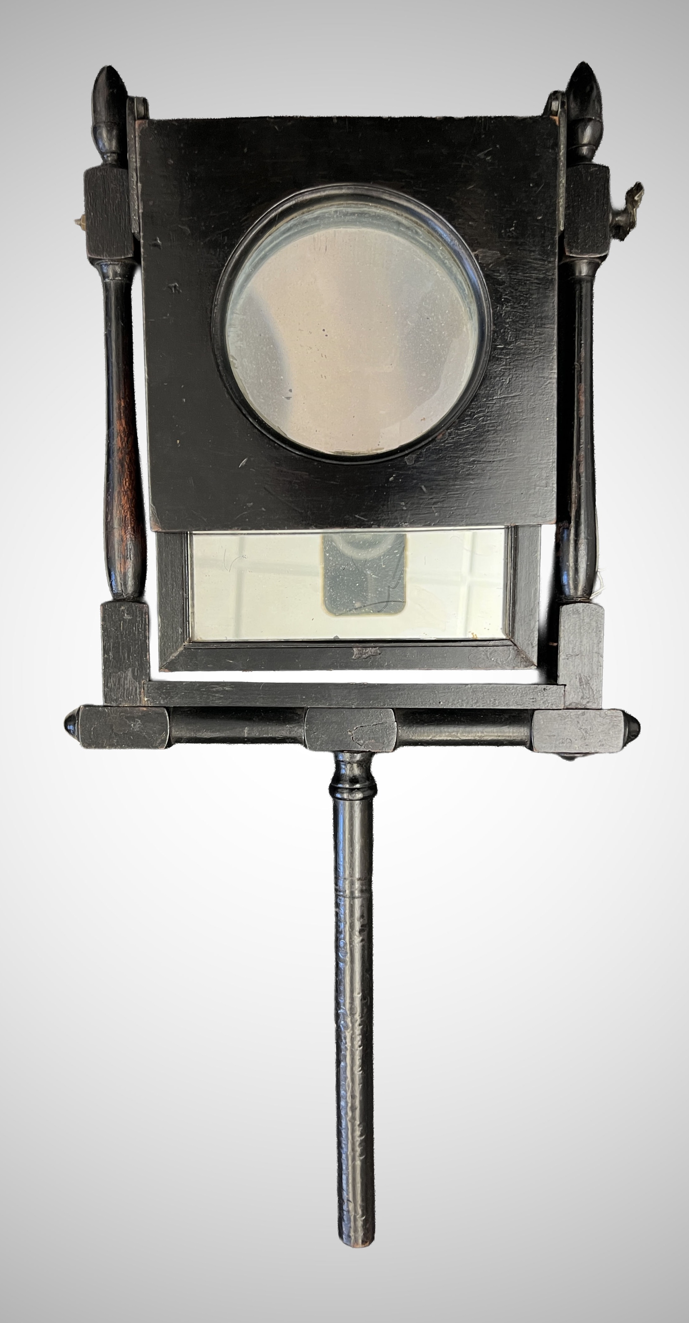 This example is quite tall relative to other zograscopes – 24.8 cm from the T-bar to the top of the mirror frame. The lower shaft would have inserted into a wooden turned base and could be adjusted for height. This component too was unusually long – 20.2 cm. Different people or perhaps different sizes of prints demanded that the height (and distance between lens and print) be readjusted. Dents from the wooden thumbscrew indicate frequently adjustments and a wide variation (16.5 cm) in what was thought to be the right position.