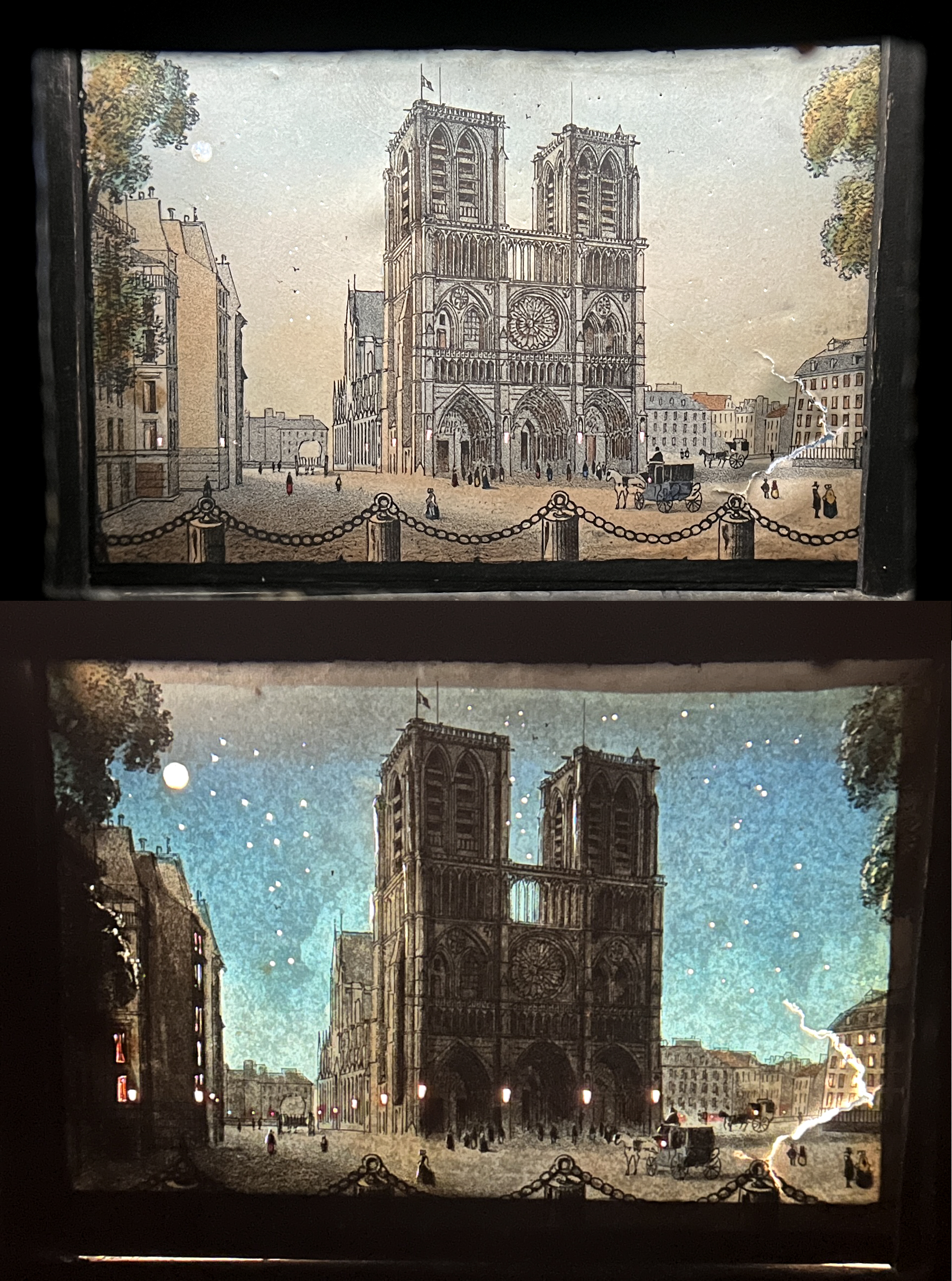All three have the same mechanism for illumination. They are designed for paper dioramas (figure 69056.3). Paper dioramas are images made up of more than one translucent layer. The first image-layer, a print or photo, often has piercings to let light through to create relatively bright light effects – like stars or brilliant chandeliers. Under-layers can consist of additional images that become visible when the image is back-illuminated. These revealed images might be of figures, for example, that emerge within the first image or else entirely new images (more properly then called ‘dissolving’ views). Under-layers can also include masks that strategically dim the backlighting and coloured washes that introduce atmospheric effects like the glow of lamplight or fire (see figure 69056.2). You can see the effect in a polyorama panoptique view which is identical in form.