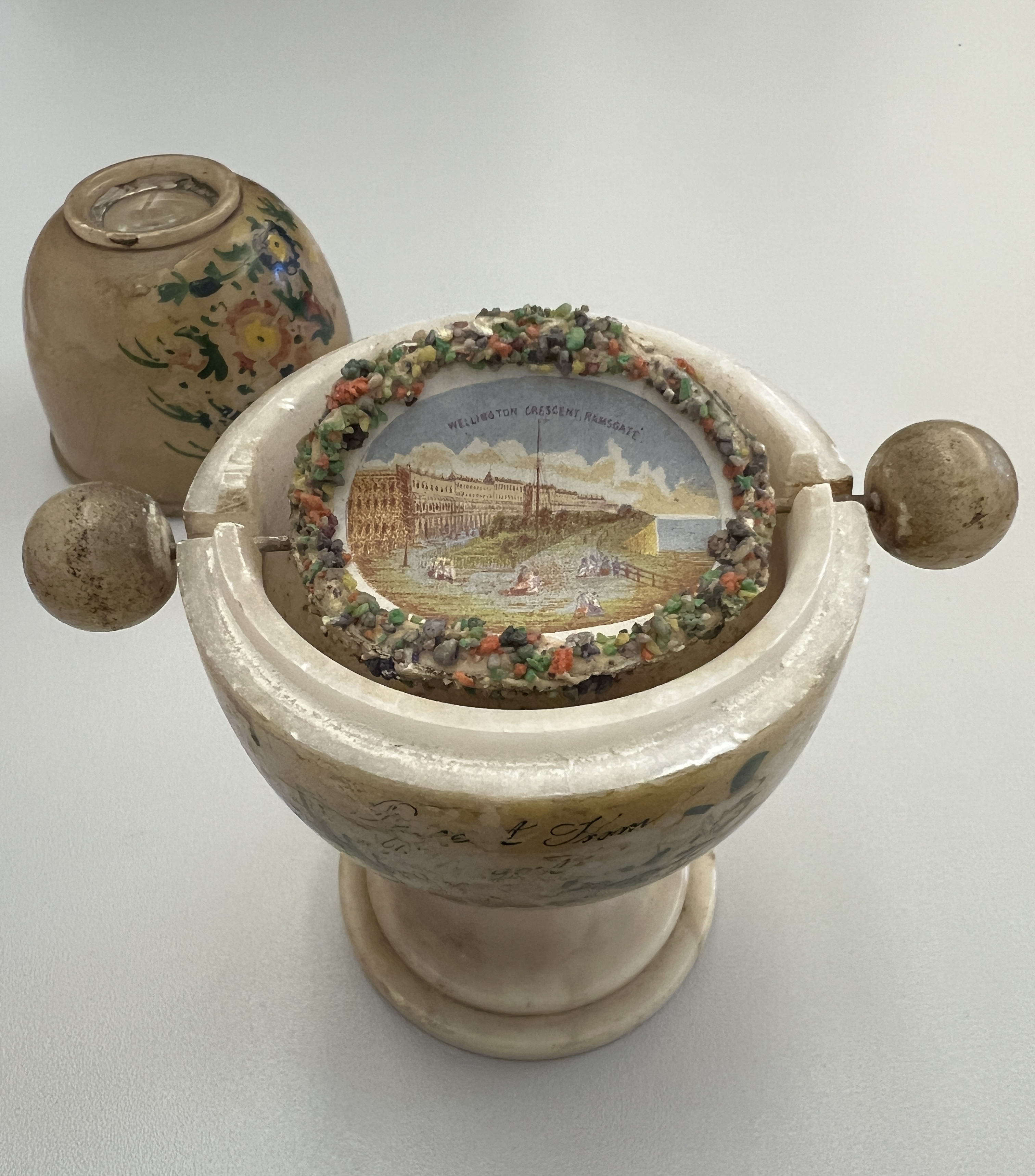 Three different views can be interchanged by turning a spindle by means of two side-knobs. Two are lithographed images framed by coloured pebbles: Wellington Crescent, Ramsgate and Ramsgate Harbour. One is a "faux terrain"[3] in which an undersea world is represented by coloured sand, shells, lichen and crystalline substances made to look like seaweed and coral.