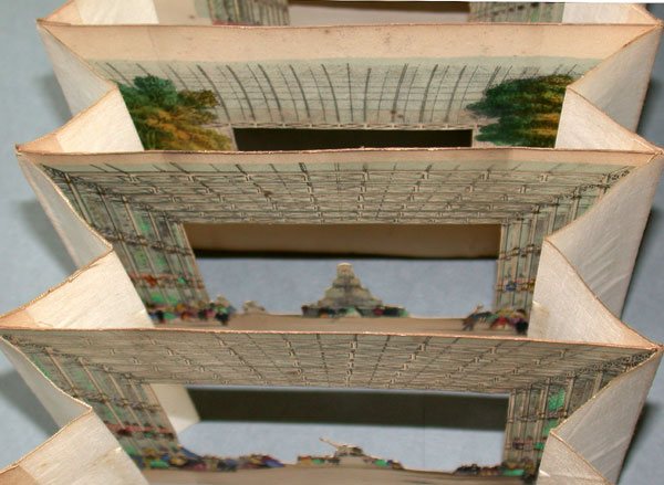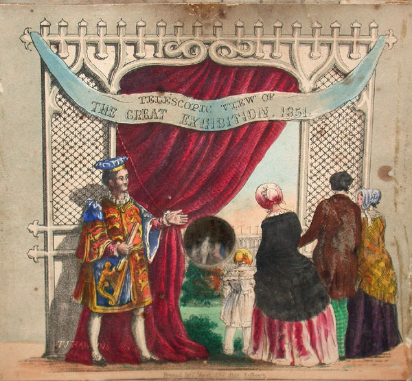 This is a folding theatre maquette with a peephole through which one views multiple paper coulisses showing the Great Exhibition of London, 1851. The peephole lacks a lens so it cannot be considered an "optical machine ," but is included in the Optical Machine Taxonomy as an outlier.