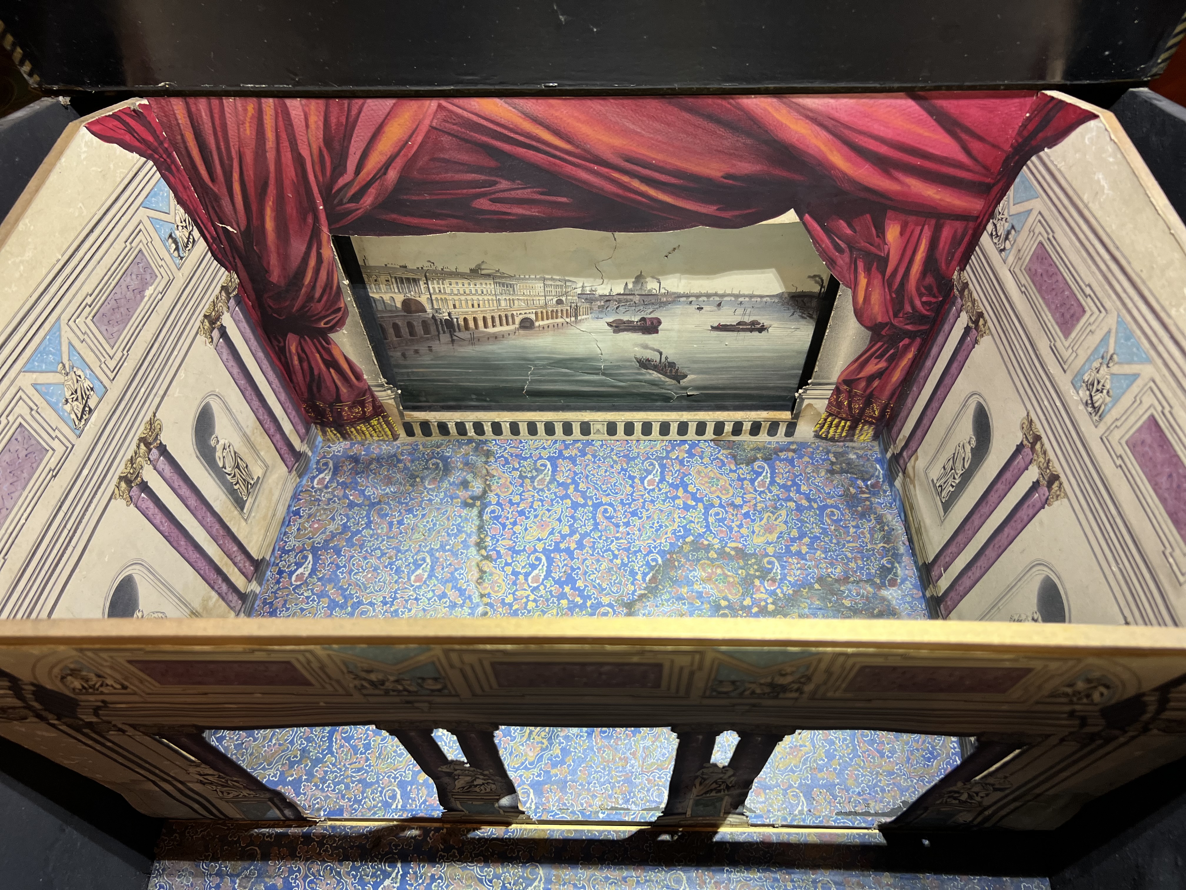 Illumination: The front and back flaps, one on top of the auditorium and one on the rear light-box, are designed to admit natural light or some external light-source onto the views. back-illumination brings out special effects in the paper dioramas. Mondo Niovos also include candle-holders behind the lens-array and within the rear light-box to enhance the illumination and to illuminate at night. There is no evidence of candle-holders in this box. That is a bit perplexing in the case of the light-box, because the only reason for extending it is to provide a platform for the internal candles. All of the known Lefort boxes rely, like this one, only on natural light or external illumination. It may have been that bourgeois households of the mid-19th century were better supplied with artificial lighting (e.g. gaslight, argon lamps) than 18th-century elite households.