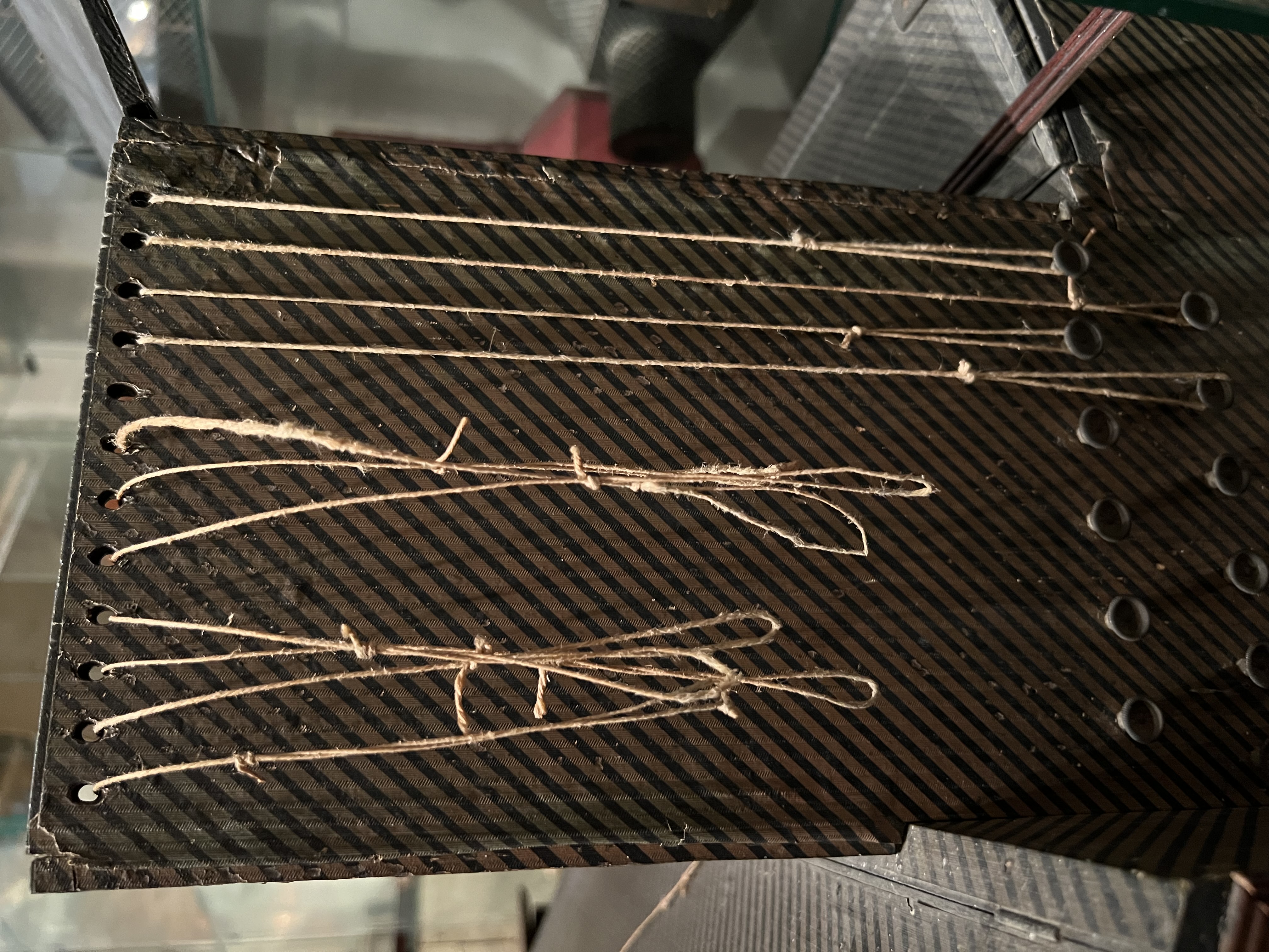 Figure FB-POL-34.4 –Flytower from the TopThe strings are incorrectly strung here. They need to go up and over the wire stringer-bar so that they pull upwards. Photo © Ana Mendes. |