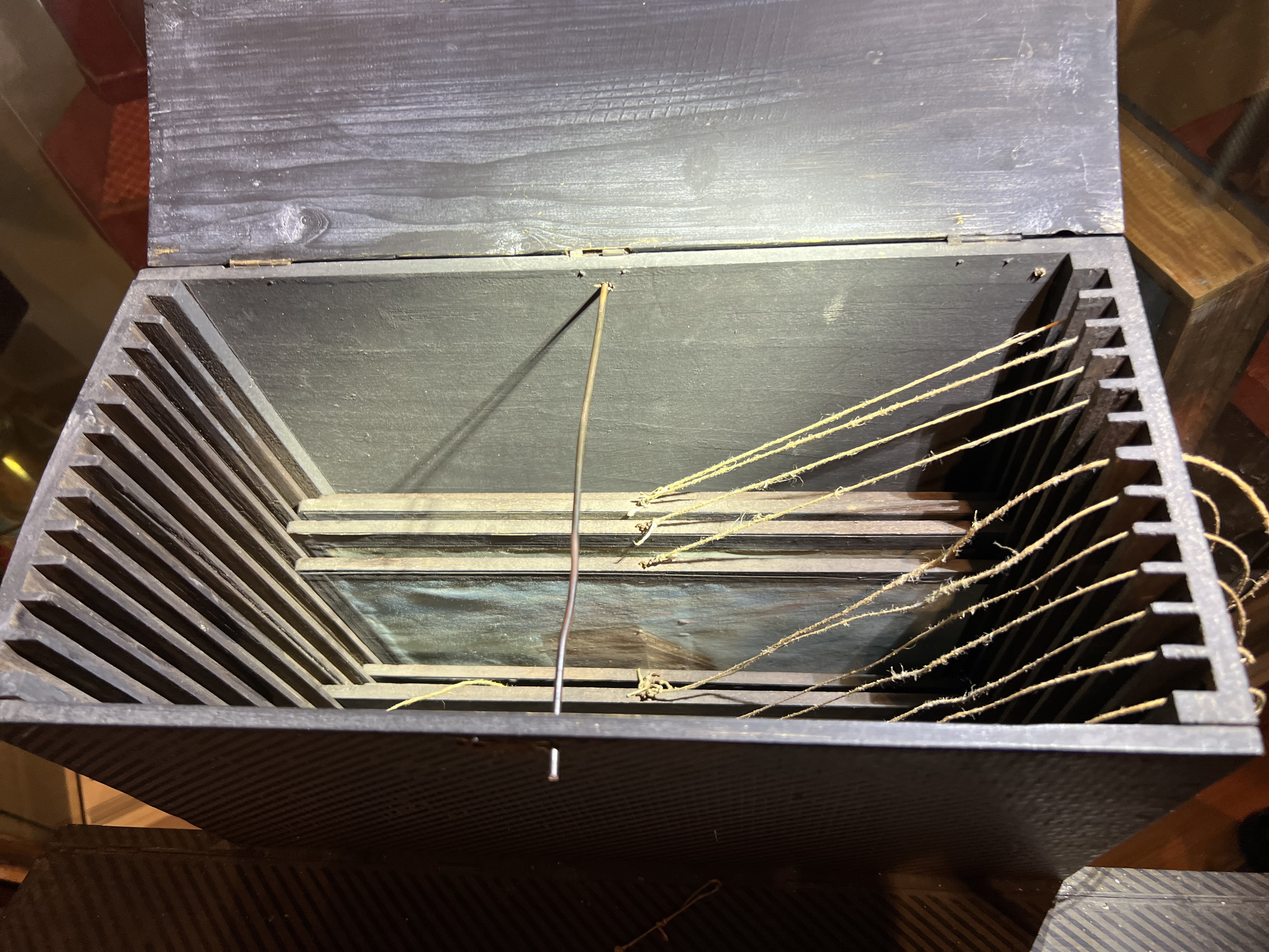 Flytower: Mondo Niovo flytowers typically have 4-5 vue d'optique images per guide-slot. This one has one slot per plaque dioramique – 12 in total. This flytower holds a smaller number of views than the average of 21 for Mondo Niovos. The views are raised and lowered by strings that go straight up and over a stringer-bar, then across to holes in the side of the box. When raised, they are secured to metal buttons on the side of the box (Figure FB-POL-34.2). The stringer bars in Mondo Niovos have grooves or keyholes to keep the strings separate. The stringer-bar in this flytower is a bare wire (Figure FB-POL-34.4). The maker has relied on the channels to keep the views and their strings from colliding and getting tangled.