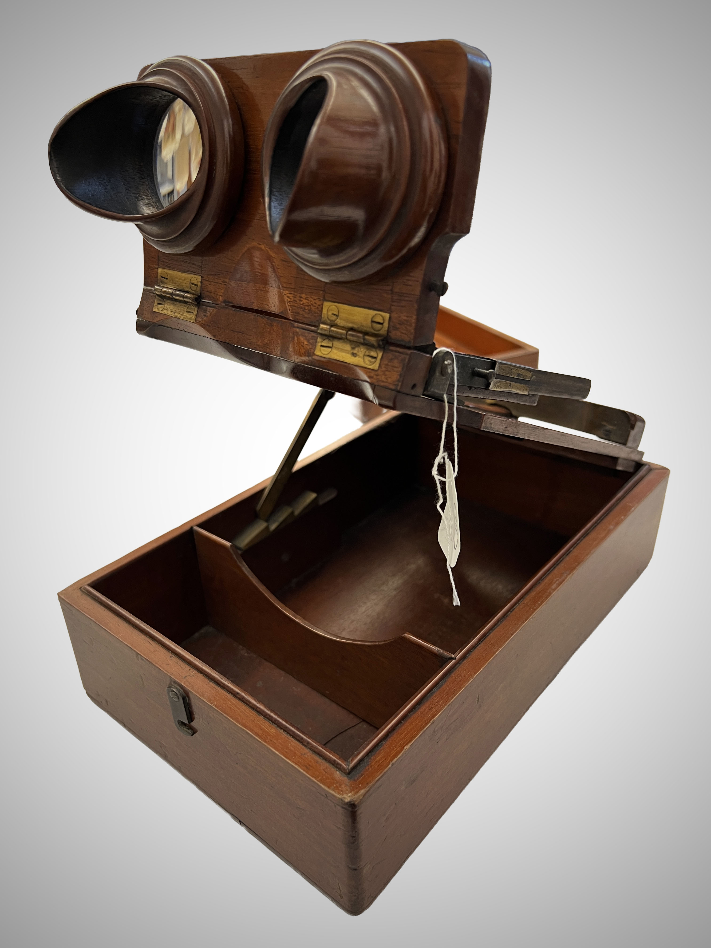 This is the inventor's original folding design with a tilting platform and rectangular base. The monoscopic and stereoscopic lenses interchange. The monoscopic lens folds either under or over the platform to make way for the stereoscopic lenses. When the monoscopic lens is in place, the stereoscopic lenses fold down.