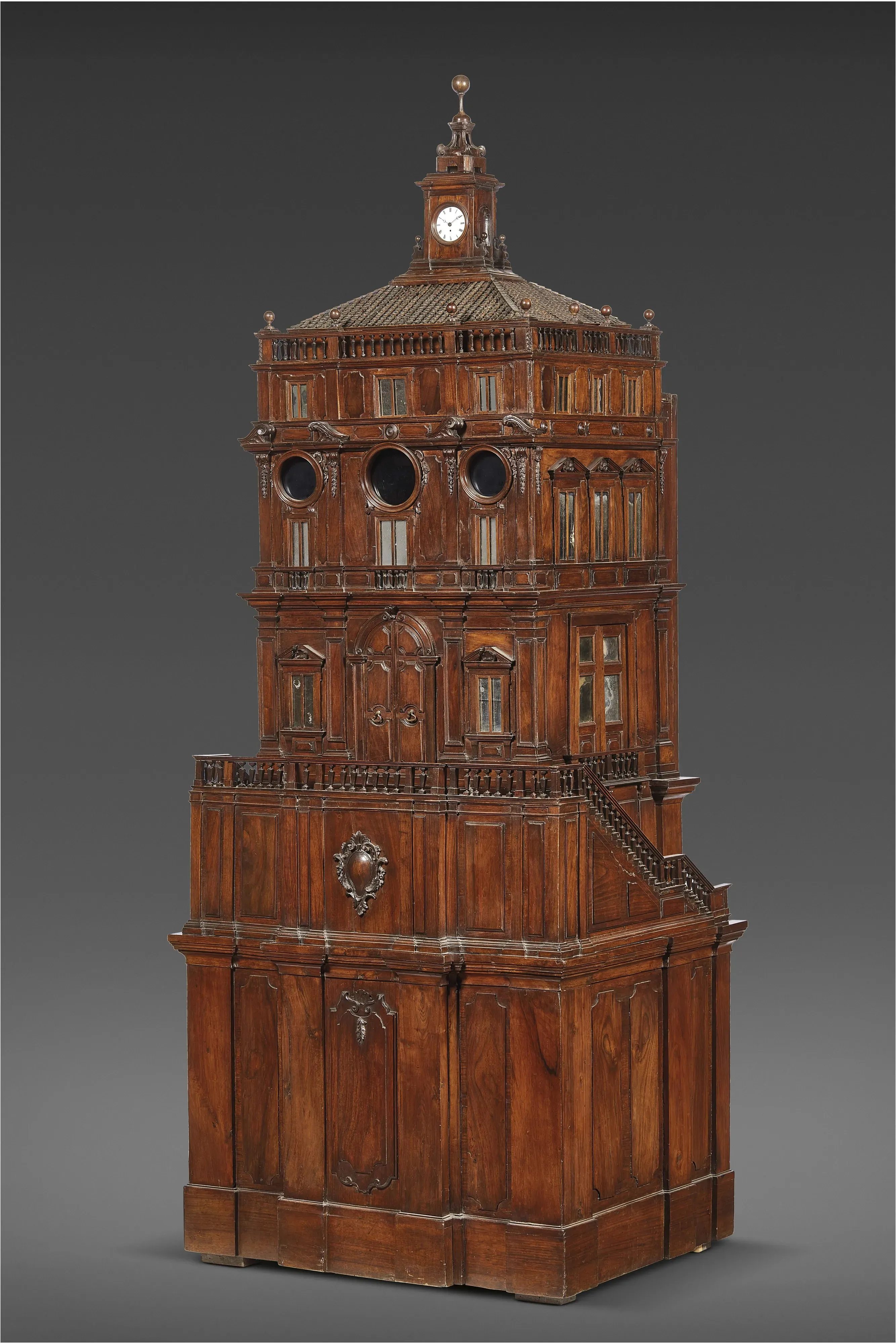"Architecturally designed to resemble a three-story building, the work is crowned by a lantern with a clock and rests on an architectural base with a double balustraded staircase supporting the elegant central wooden cabinet, where the projection took place.