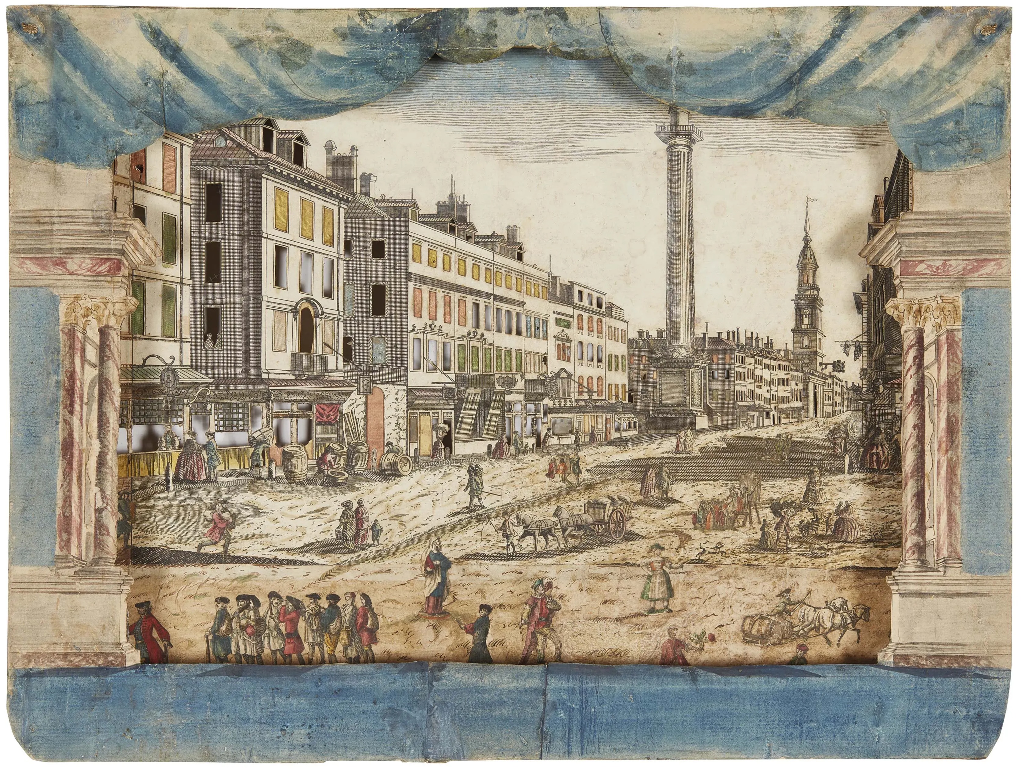Like many Raree Shows, its views, 10 of them on wooden frames, are attached to rigging so they can be raised and lowered from below the "stage." It is unusual in having a lower fly with a unique internal mechanism.