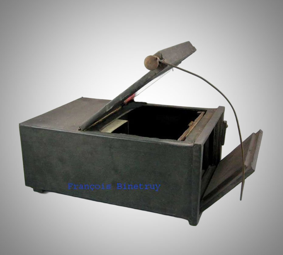 This box is papered in black with an unusual wire mechanism for synchronizing front and back illumination. It is likely not a Lefort box.