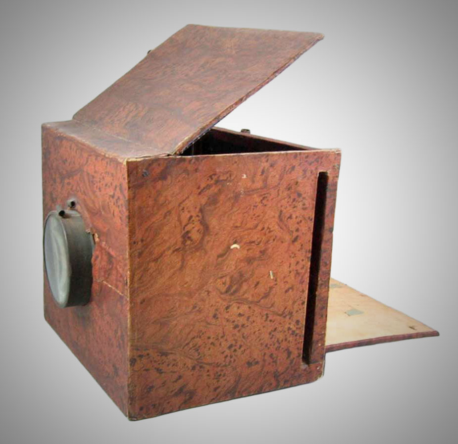 This box is papered in brown with a faux burled walnut pattern. It has a tin lens-frame and lens-cover. It is likely not a Lefort box.