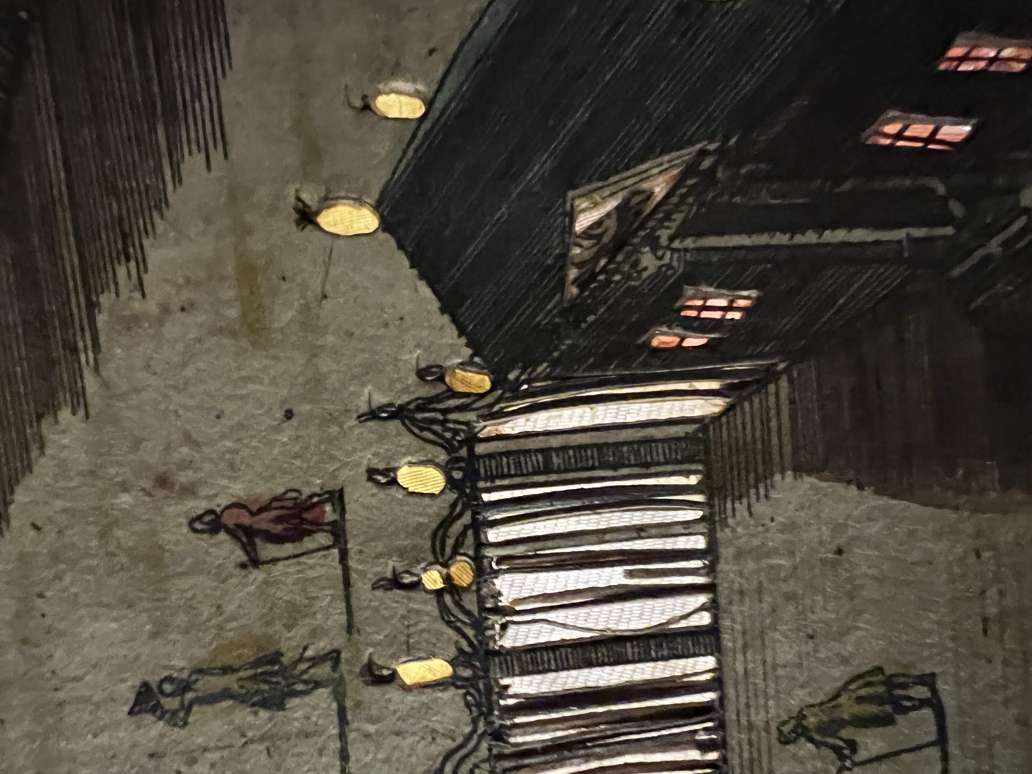 Under the front-flap, Pinelli has depicted 4 semi-circles that might be windows over top of which are little awnings. They make no sense functionally. As illumination, they could only shed light on vues d'optique that were hidden from view in the flytower.