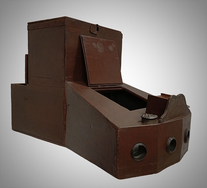 Structure: Mondo Niovos all have two artificial/natural light-boxes: one at the front and, very distinctively, one at the back (see Figure MNC-M01033.2). The back-extension places distance between the candle-flames and the paper images. The front candles are positioned behind the lens-array and are exhausted through characteristic chimneys. The Mondo Niovo pull-string mechanism takes the form of a flytower so that the unused vues d'optique hang above (rather than below) the exhibition stage. These three features give the box its characteristic profile (Figure MNC-M01033.2).
