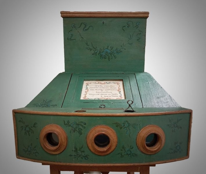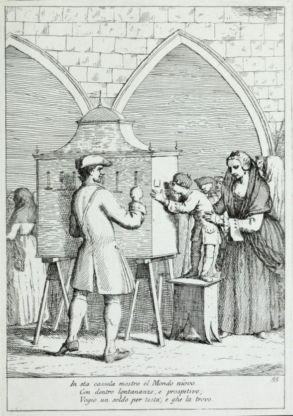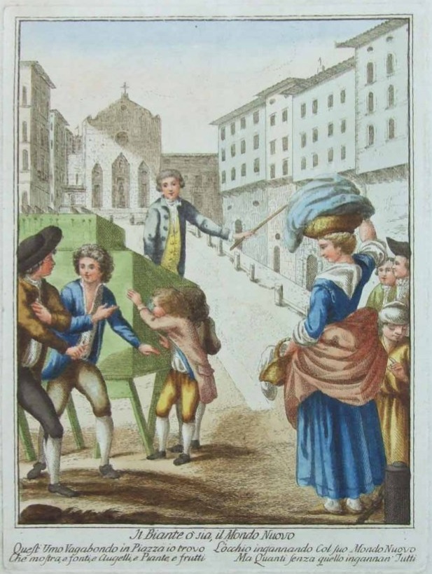 There are six known examples of Italian show-boxes – all of them take the very particular form of the mondo niovo as we have described it here. However, of the period images that we have of Italian show-boxes, some of which are labelled "mondo niovo," none of them take that form. So, we have an anomaly that demands some explanation.
