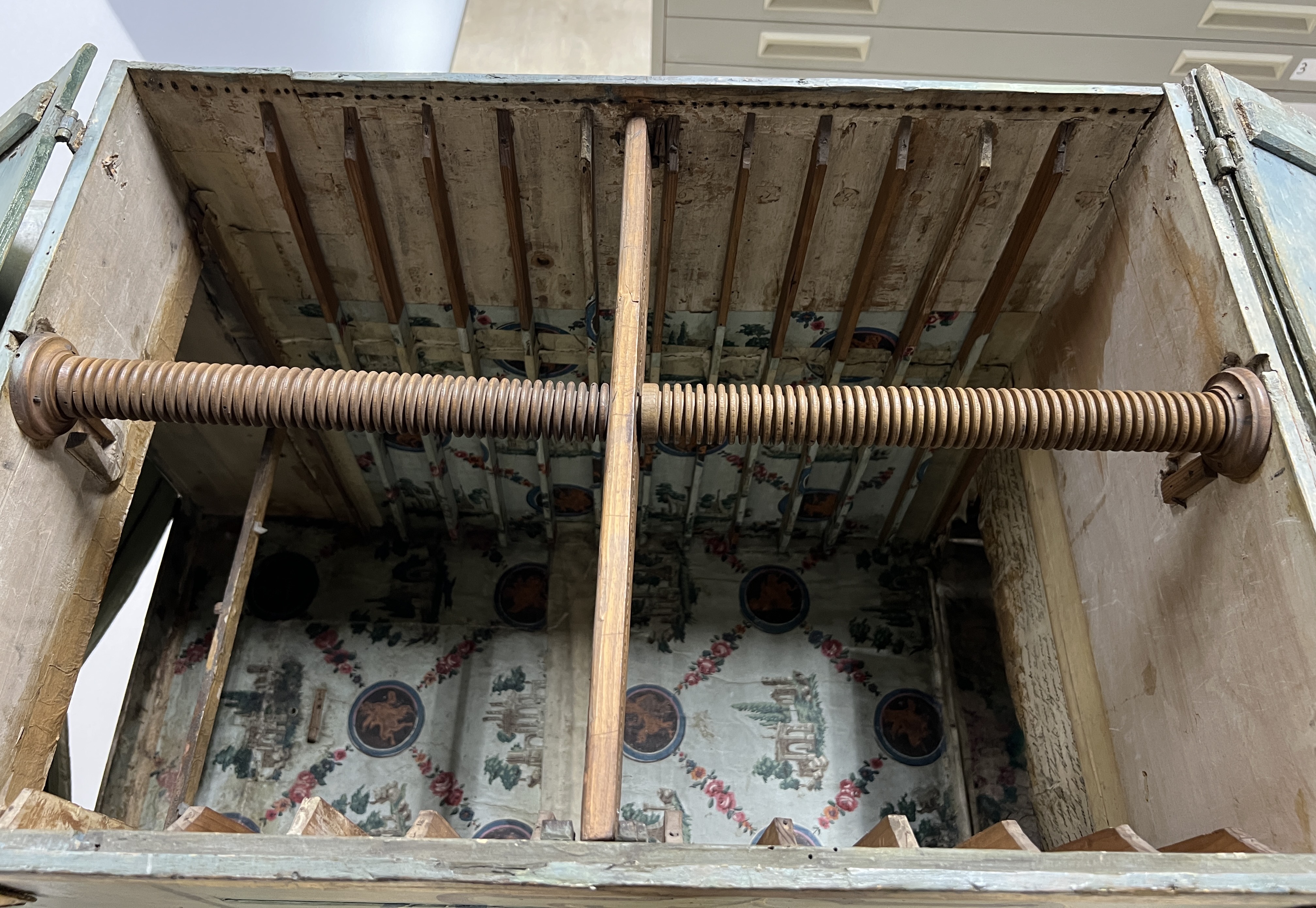 Note the stringer-bar (the grooved dowel) and the hinged flaps (top left and right). The channels on the sides are meant to guide the vue-frames as they descend and ascend. This area would normally be stacked with vues d'optique on their frames.