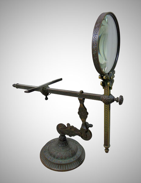 This viewer was patented by James Cremer in 1875. The missing image-plate would have sat upon the T-bar on the left side of the cross-arm. The magnifying-glass (clearly it could be used independently as such) is removable, and there was a Holmes-style stereoscopic hood that could be secured in its place.[xxx] All points of intersection in the cross-arm and lower armature are adjustable and secured with thumb screws.