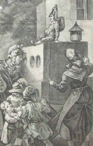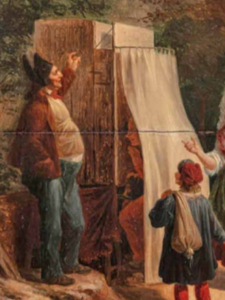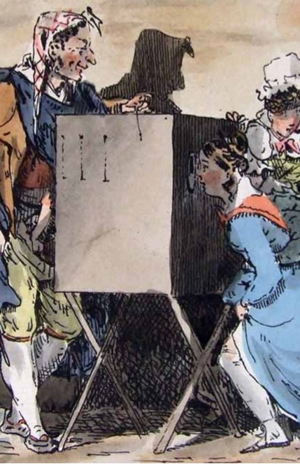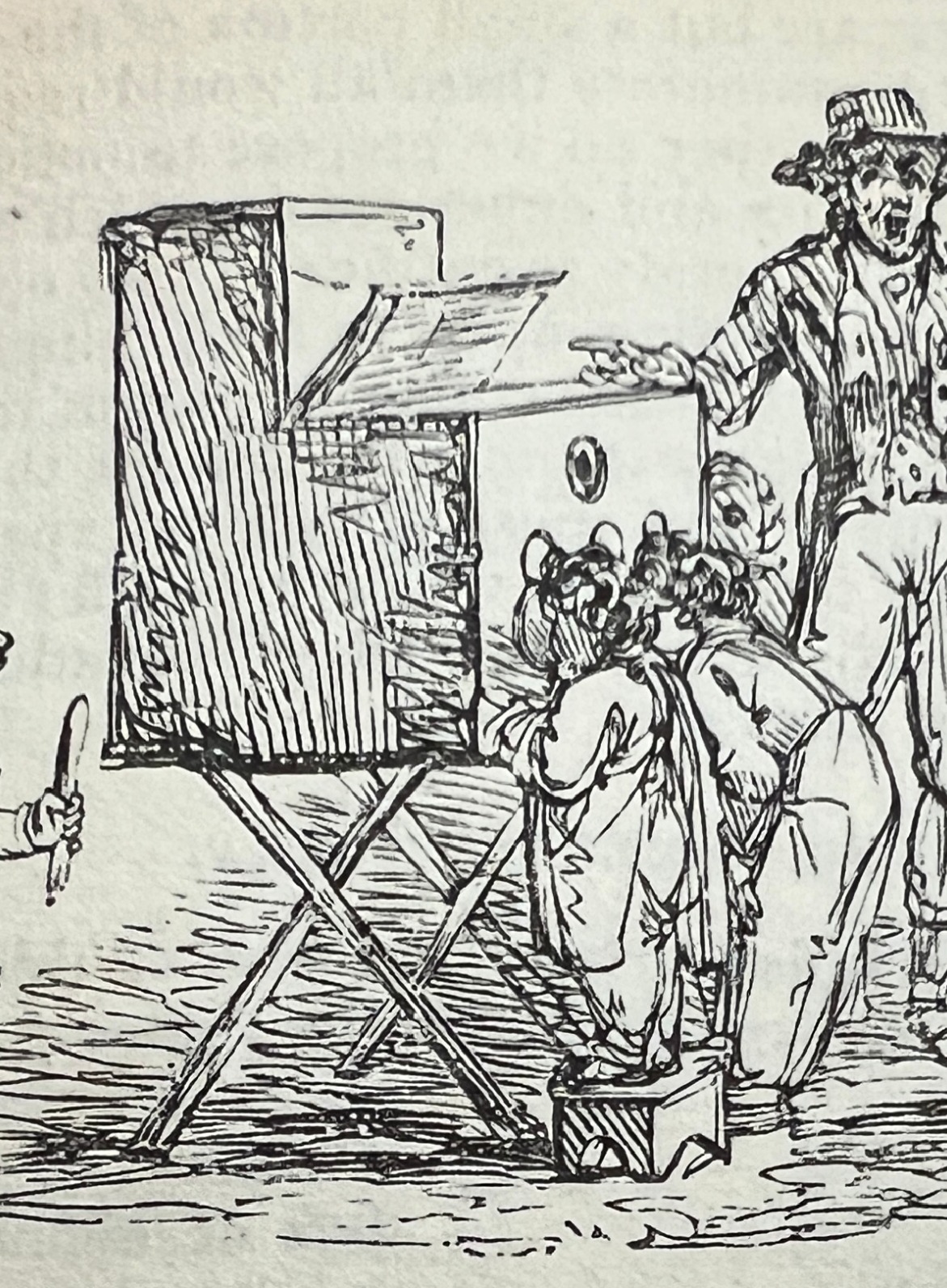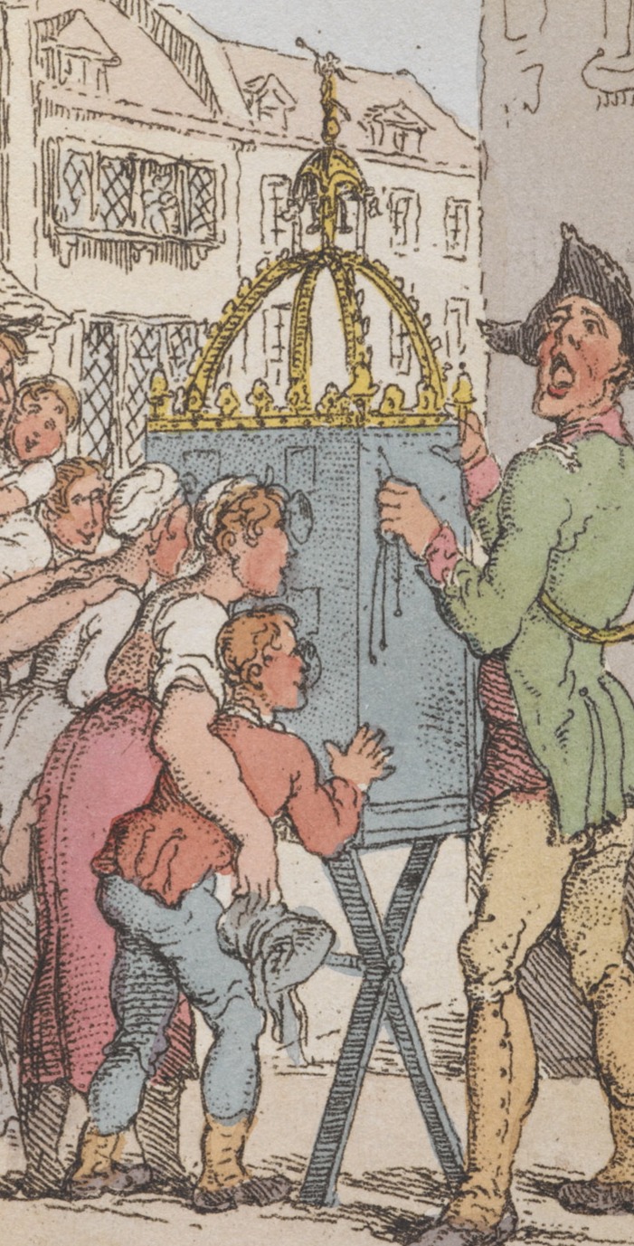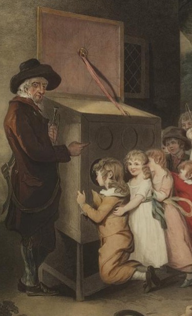 The Raree Show, "peepshow," or "show-box"[1] was a travelling optical machine with multiple lenses and a draw-string mechanism for multiple scene changes. Itinerant showmen toured these to fairs and markets around Europe until the late 19th century. They were the most wide-spread and well-known of the optical machines, but the ones for which we have the least physical evidence. They were well-loved by millions who flocked to view their marvels. But the devices lacked cultural prestige and were rarely preserved. To understand their physical characteristics we rely on the visual evidence of numerous prints and paintings from the period.