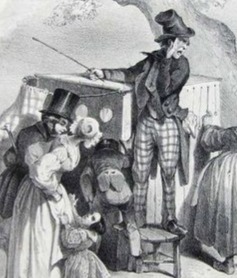 As portable devices, the raree show had to have a means of being transported: as a backpack; by hand-rails (necessitating two people); or by hand-cart.