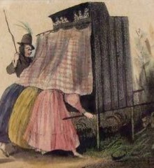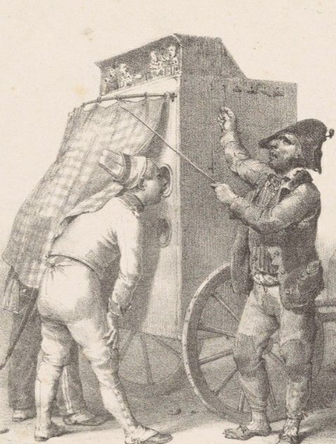 These boxes are large enough for a two-person carry. In the first case (RR-LF-R-01) you can see the hand-rails; in the second, the box is huge and the showman has his wife to assist him in pulling the strings and, presumably, in carrying the box from place to place.