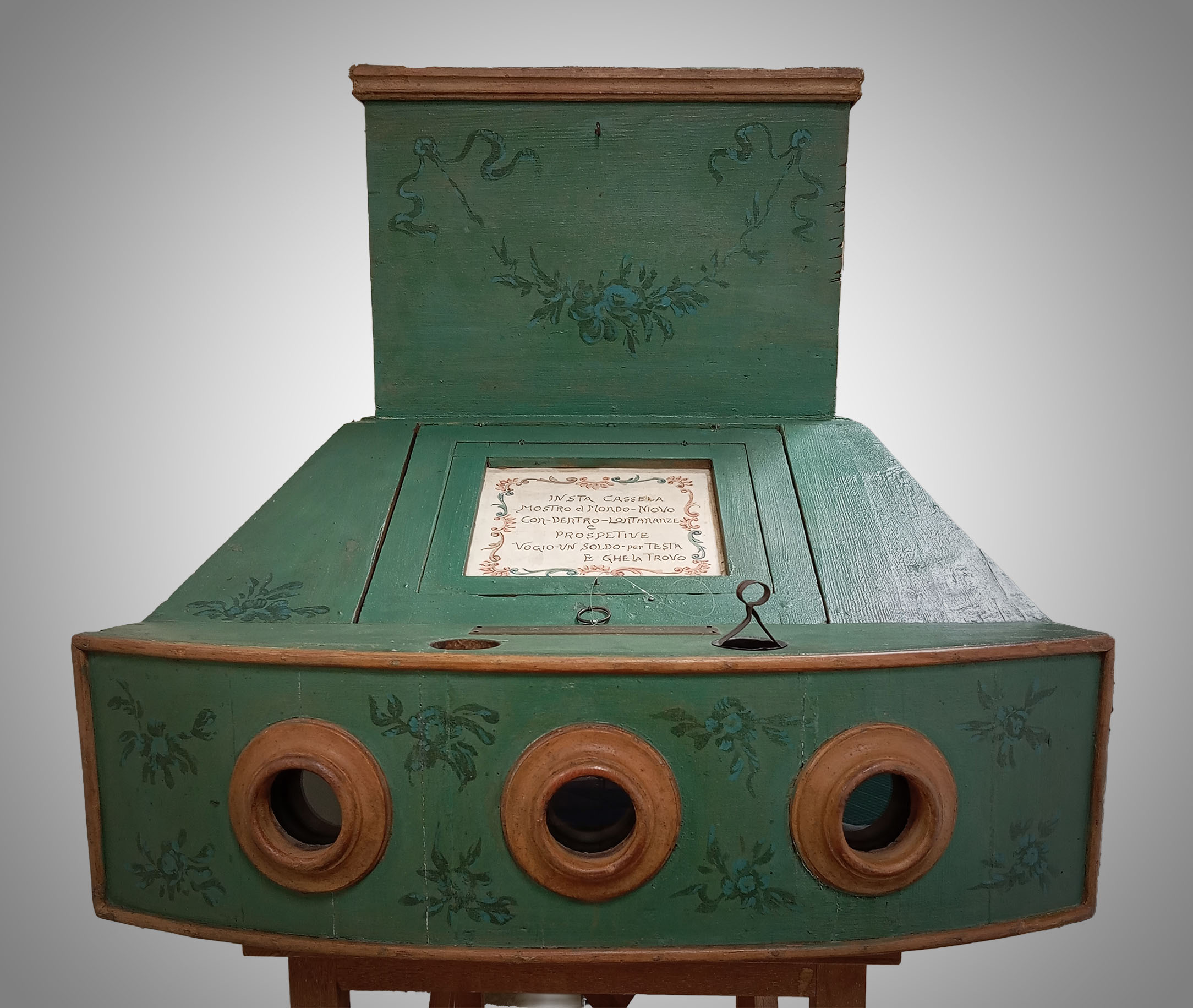 The Mondo Niovo was the Italian version of the European Raree Show – a travelling spectacle popular in markets and fairs in the 18th century. Mondo Niovos always have three related features that are rarely seen together in the raree show: