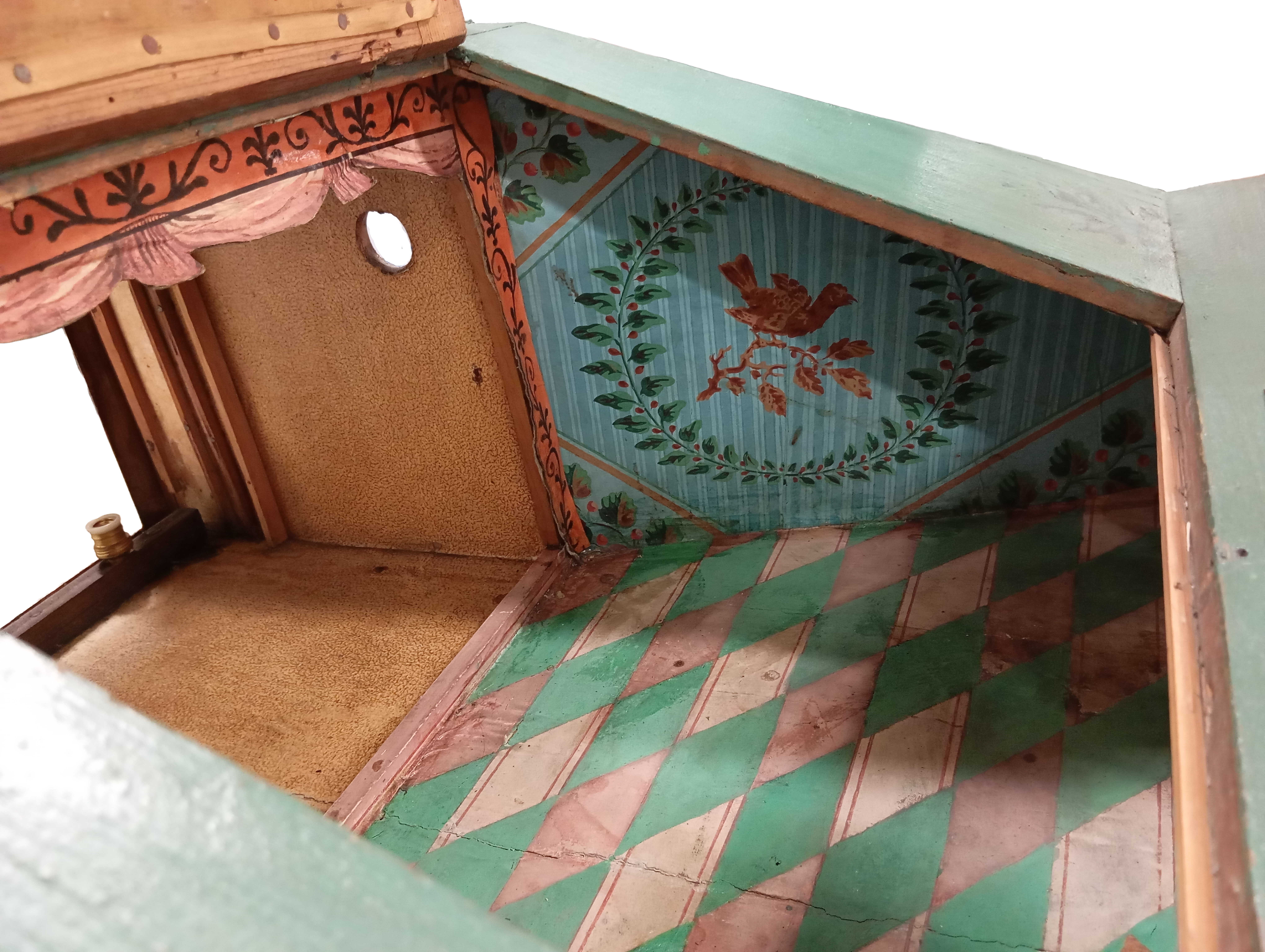 Decoration: The exterior is decorated in green paint with darker green floral patterns and edges highlighted in natural wood. Inside, it has a charmingly decorated stage (Figure M01032.3). There is a hand-painted proscenium arch and grand drape. The "audience space" is papered to invoke a tiled floor and walls with floral designs.