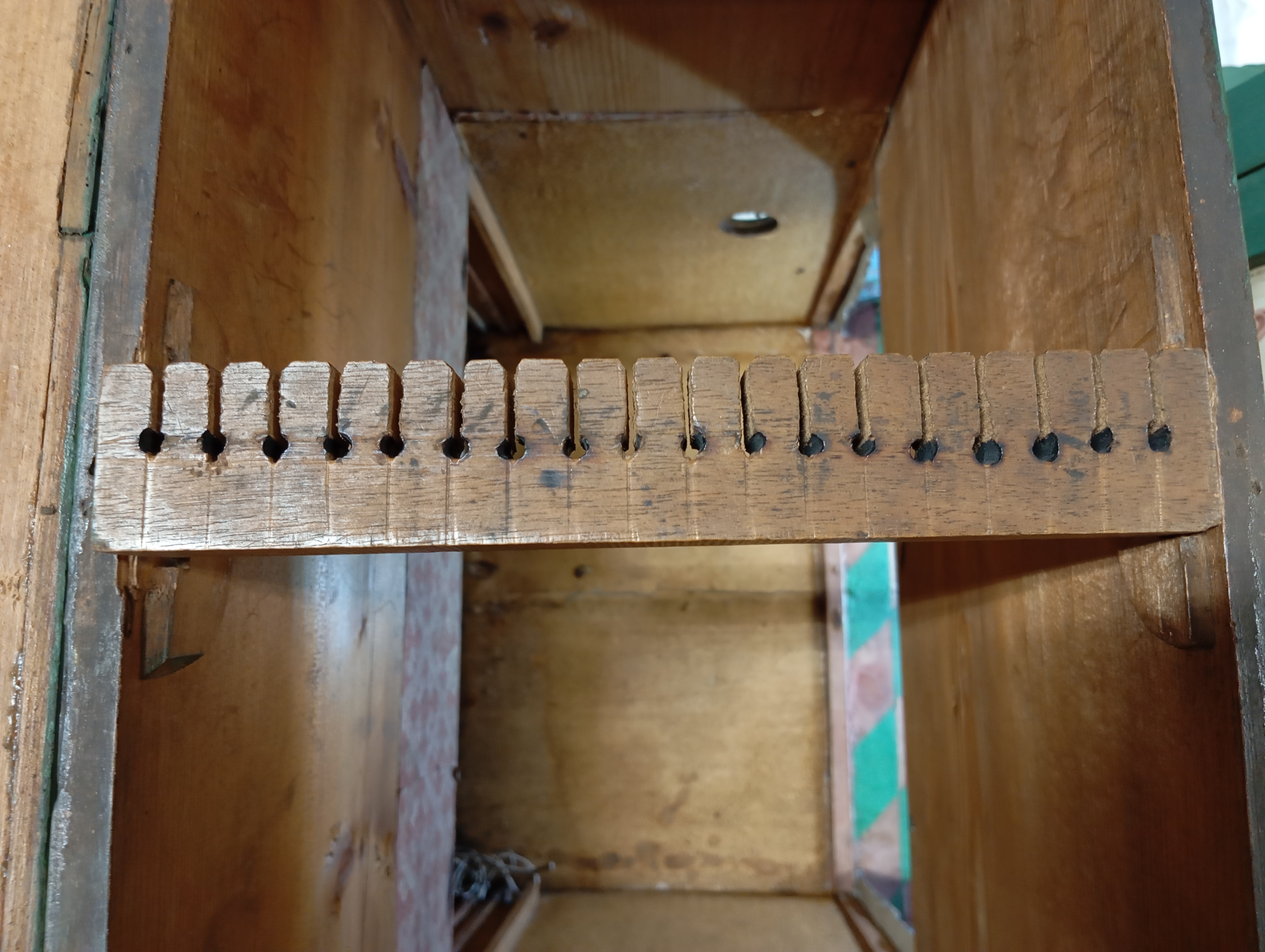 Flytower: The flytower has a stringer with 18 keyhole-style guides which also serve as pulleys for the pull-strings (Figure M01032.2). Uncharacteristically, it has no guide-channels down the sides of the flytower. It does have an inspection-hole on the upper left side (facing forward); the same side as the external pull-string array, and the side that the operator would stand. The purpose of the hole was no doubt so that the operator could check to see whether the descended images were tilted or askew – particularly important when they had no guide-channels to keep them straight.