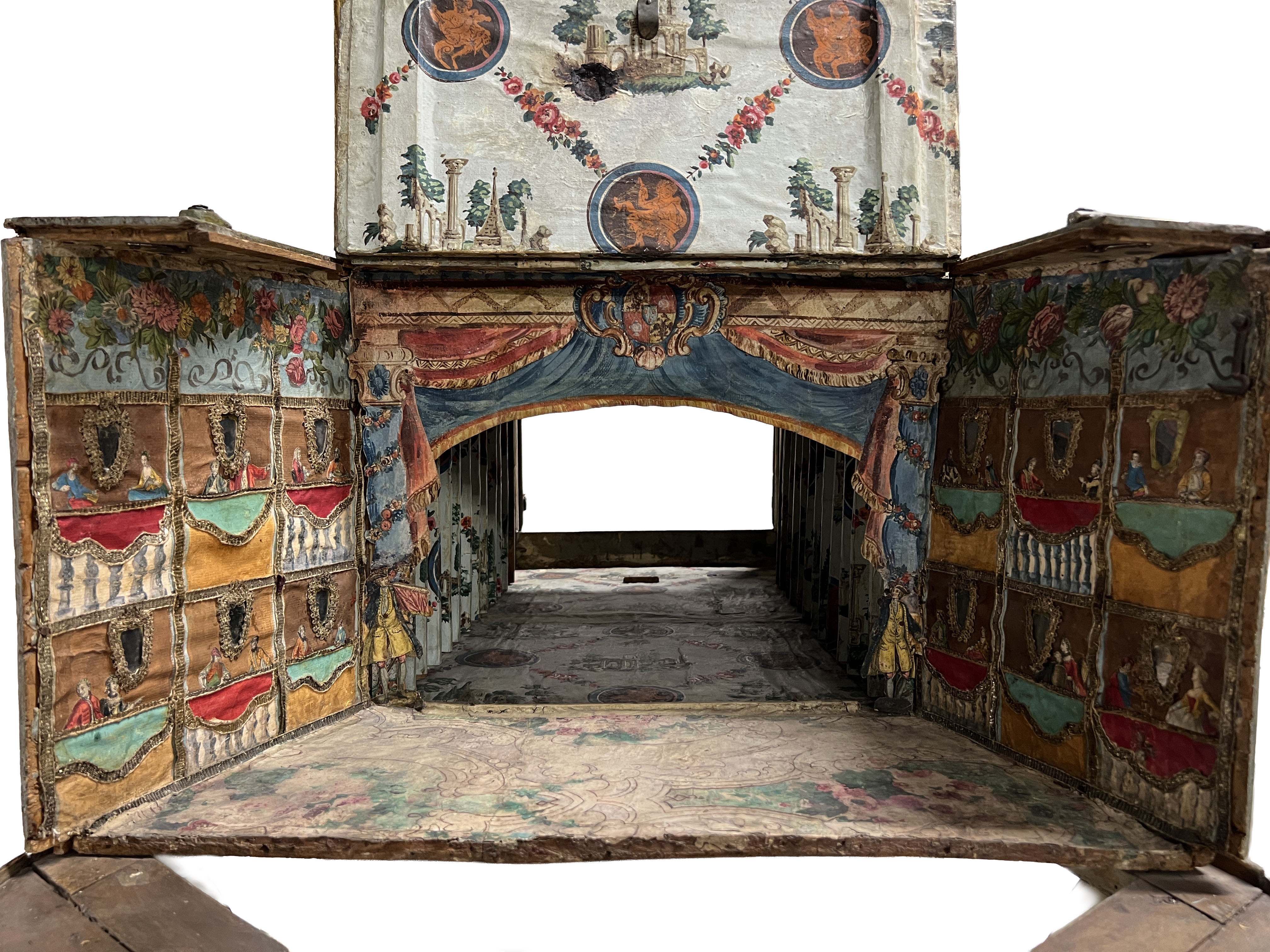 This is a view from the front of the box with the lens-array removed and the front-flap lifted up. Every interior surfaces is papered. Note the hand-painted proscenium arch and grand drape.