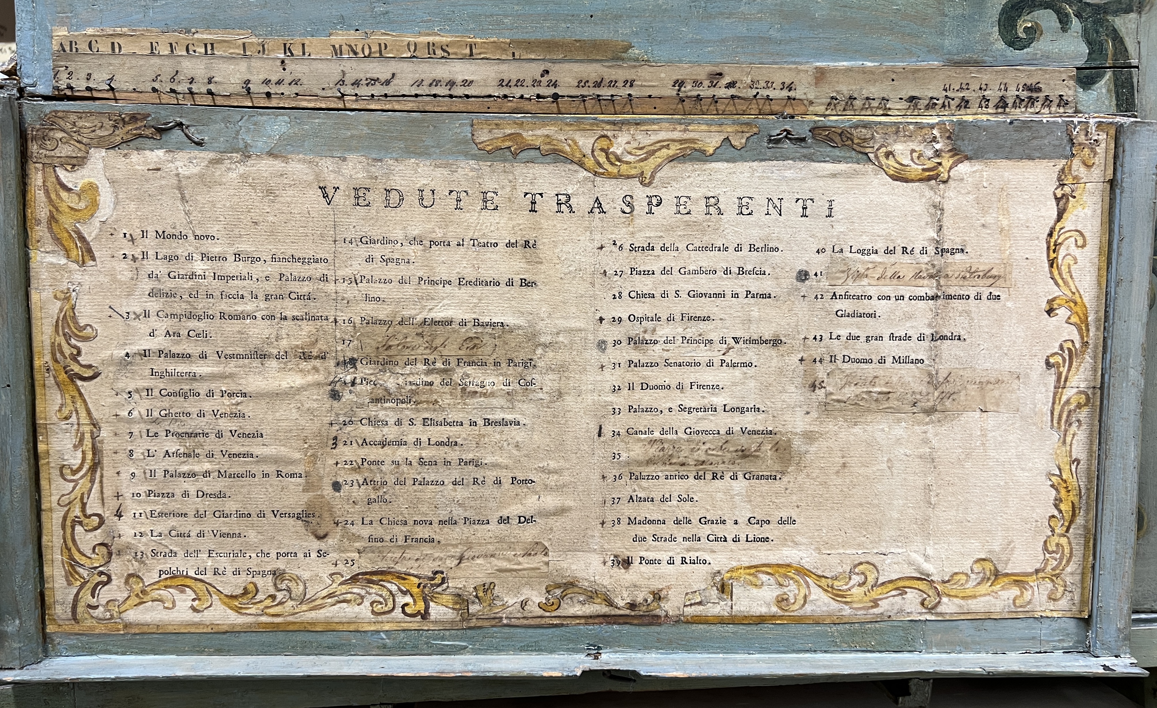 Here is the list of vues d'optique. It would be interesting to see the first one "Il Mondo Novo" to better understand the images that this term invoked in 18th century Italy.