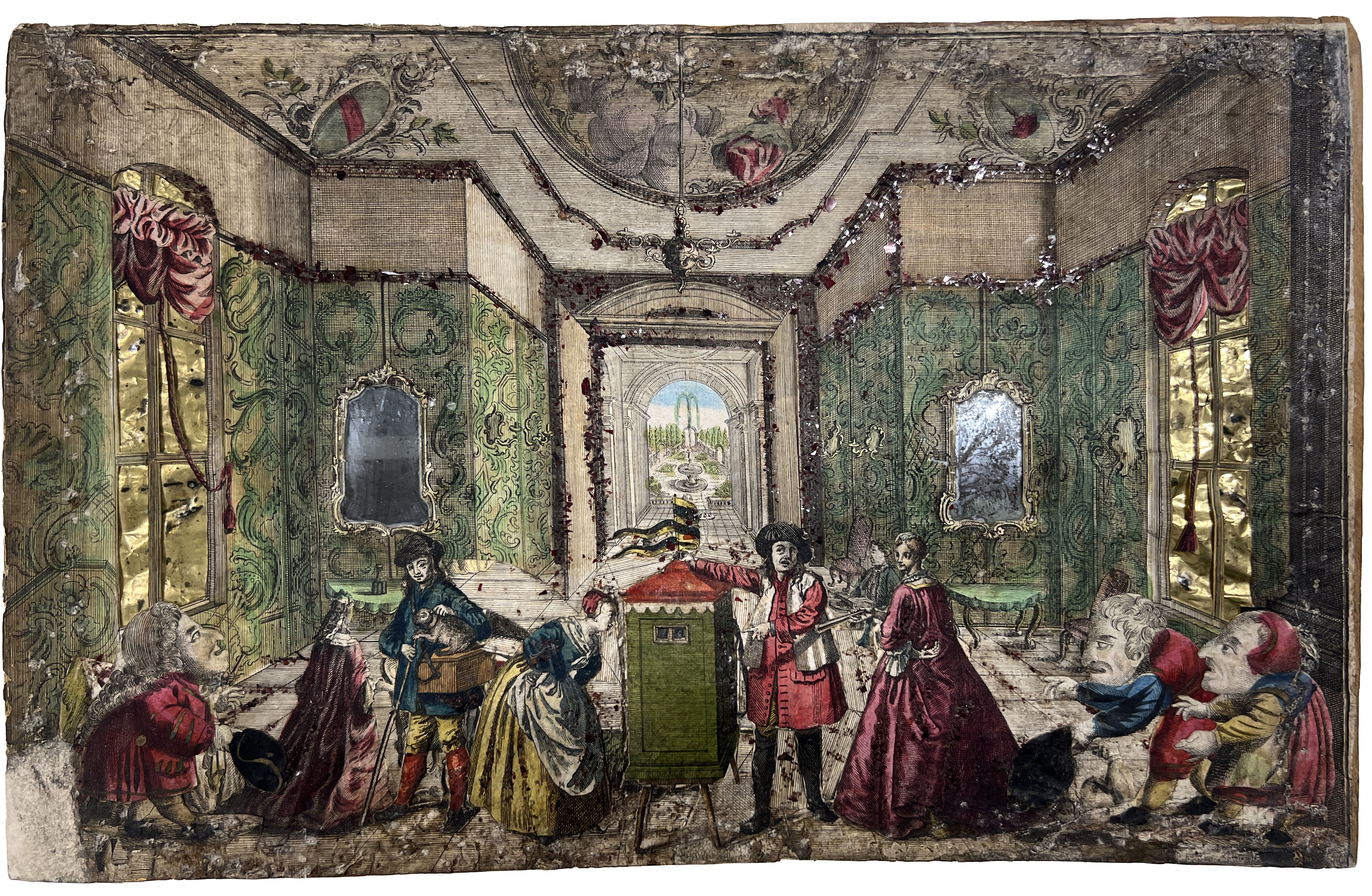 At the centre is a showman exhibiting an optical machine indoors in the way that #MNC-M01034 probably was. The grotesque figures on the right are reproduced as part of the decor in the Museo del Precinema in Padua. It would be interesting to know what their 18th-century meaning was.