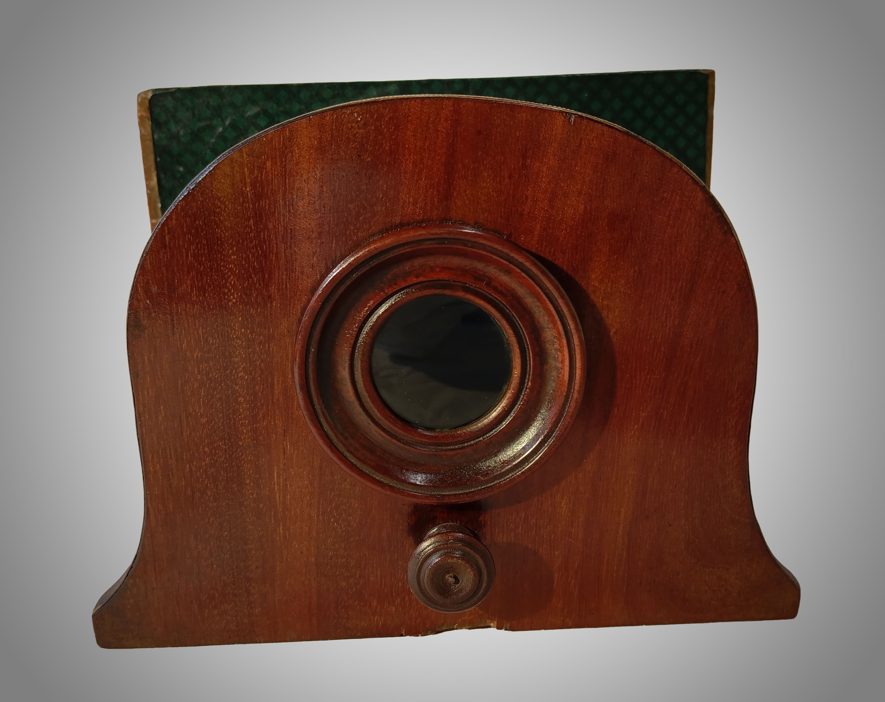 This is a viewer for paper dioramas characterized by the soft bellows for adjusting the viewing lens. It is an example of an "optical machine" and is included in the Optical Machine Taxonomy.